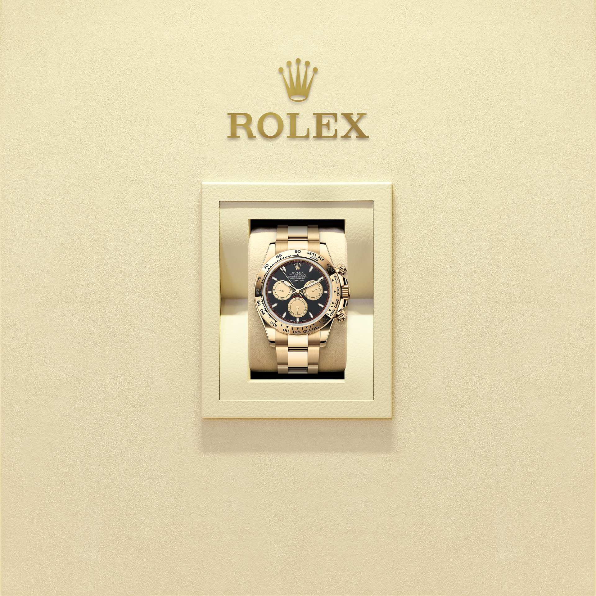 Oyster Perpetual Cosmograph Daytona: 18-karatowe żółte złoto, tarcza kolor intenstywnie czarny i kolor szampana, bransoleta Oyster, pierścień 18-karatowe żółte złoto i wygrawerowana skala tachymetryczna.