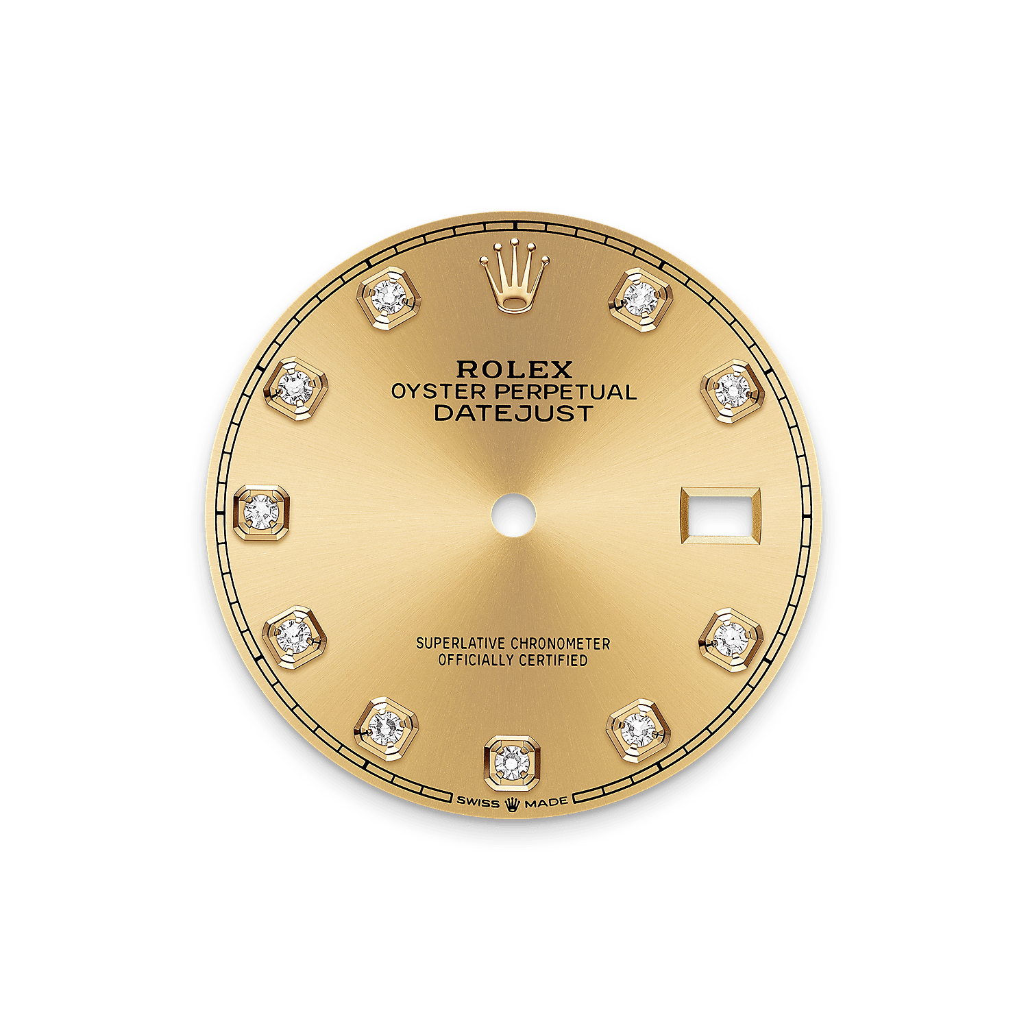 Tarcza: brylanty osadzone w 18-karatowym złocie. Szlif słoneczny zdobi subtelnymi refleksami wiele tarcz zegarków kolekcji Oyster Perpetual. Ten efekt uzyskuje się zaawansowaną techniką szczotkowania, za pomocą której powstają drobne żłobienia rozchodzące się od środka tarczy na zewnątrz.