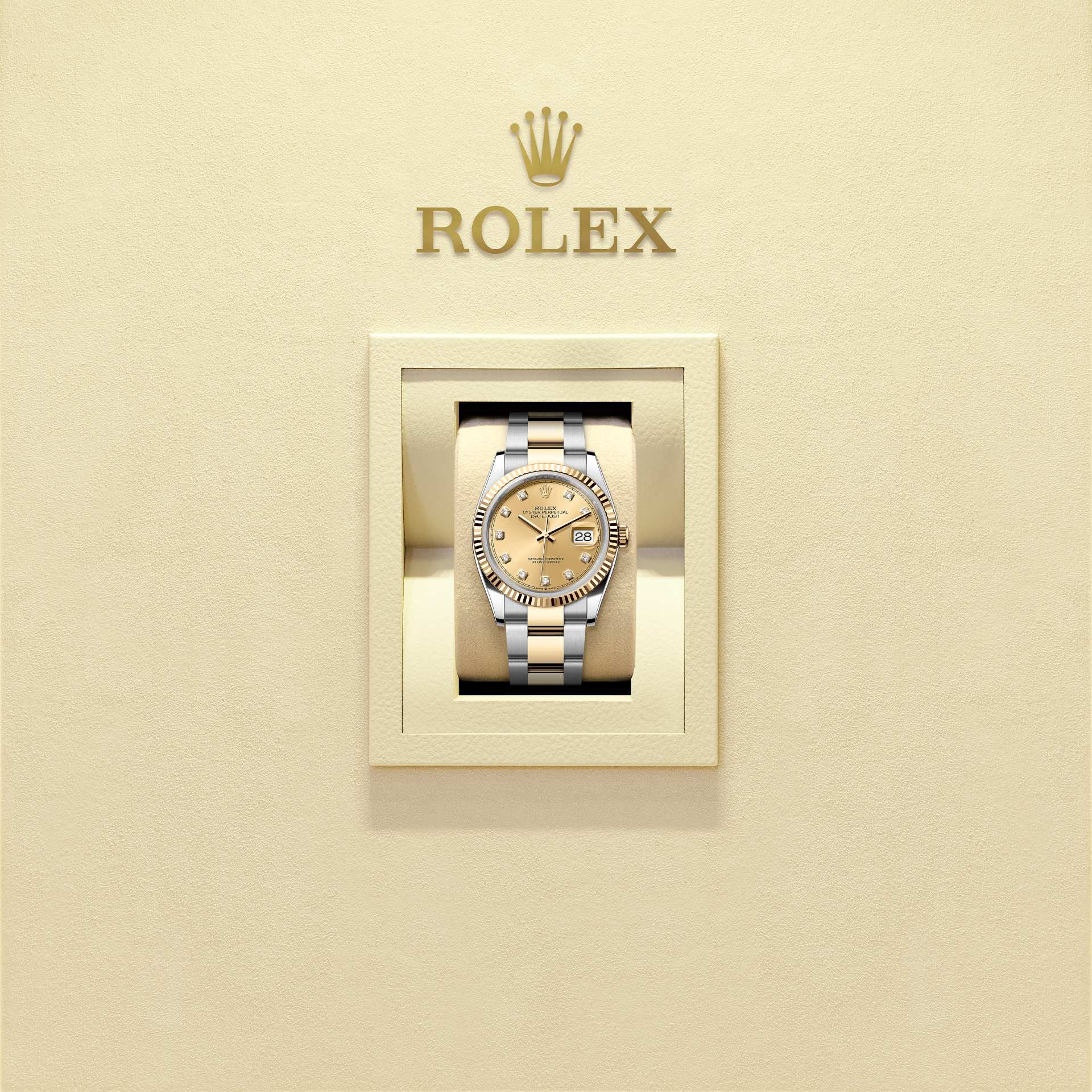 Oyster Perpetual Datejust 36: stal Oystersteel i żółte złoto, tarcza kolor szampana, wysadzana brylantami i bransoleta Oyster.
