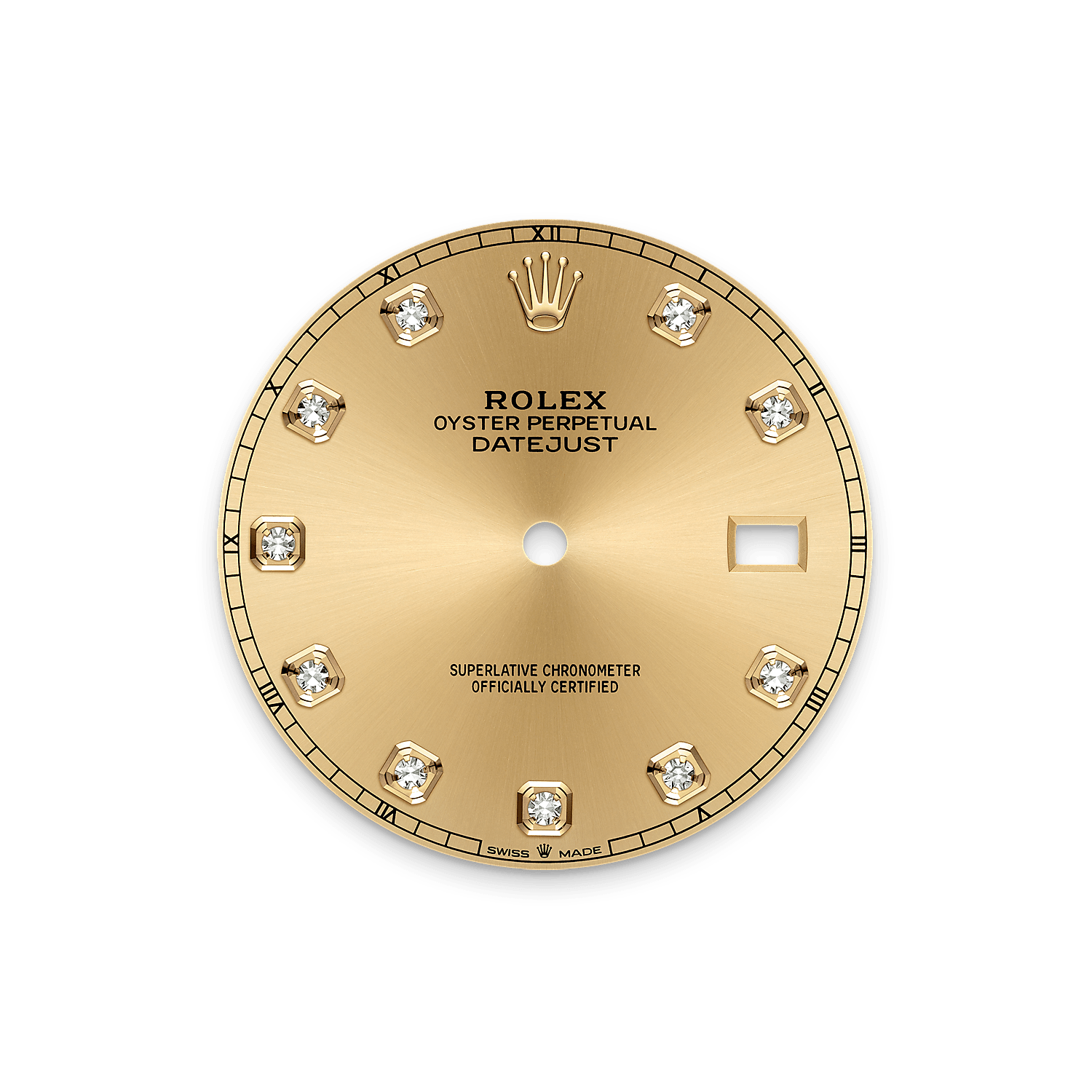 Tarcza: brylanty osadzone w 18-karatowym złocie. Szlif słoneczny zdobi subtelnymi refleksami wiele tarcz zegarków kolekcji Oyster Perpetual. Ten efekt uzyskuje się zaawansowaną techniką szczotkowania, za pomocą której powstają drobne żłobienia rozchodzące się od środka tarczy na zewnątrz.