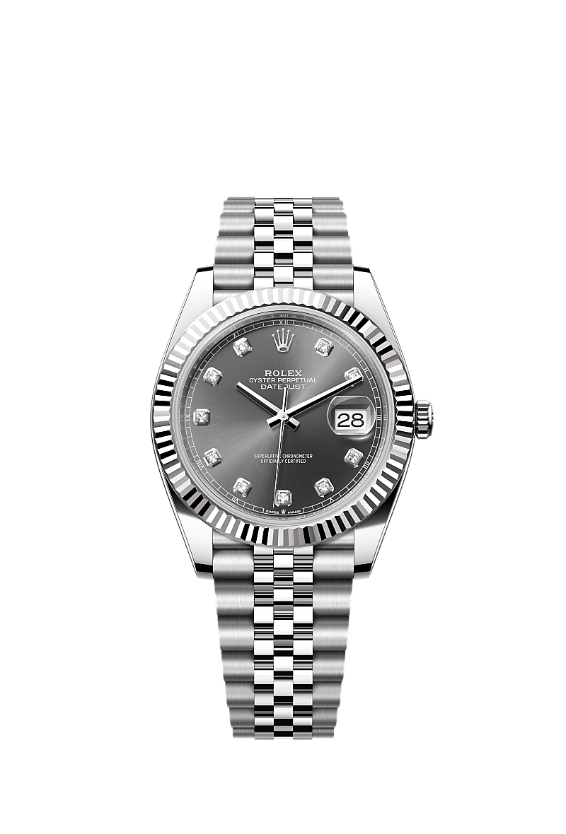 Oyster Perpetual Datejust 41: stal Oystersteel i białe złoto, tarcza kolor łupkowy, wysadzana brylantami i bransoleta Jubilee.