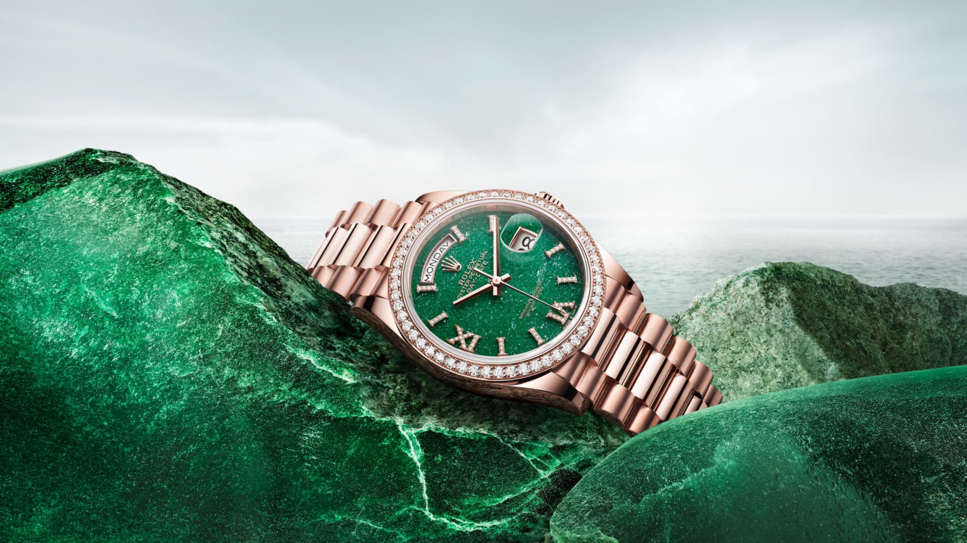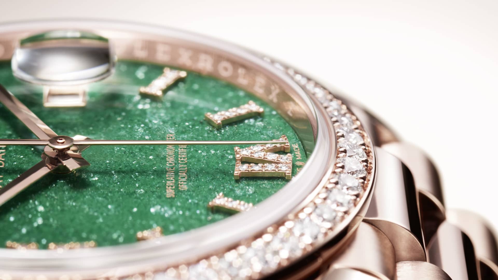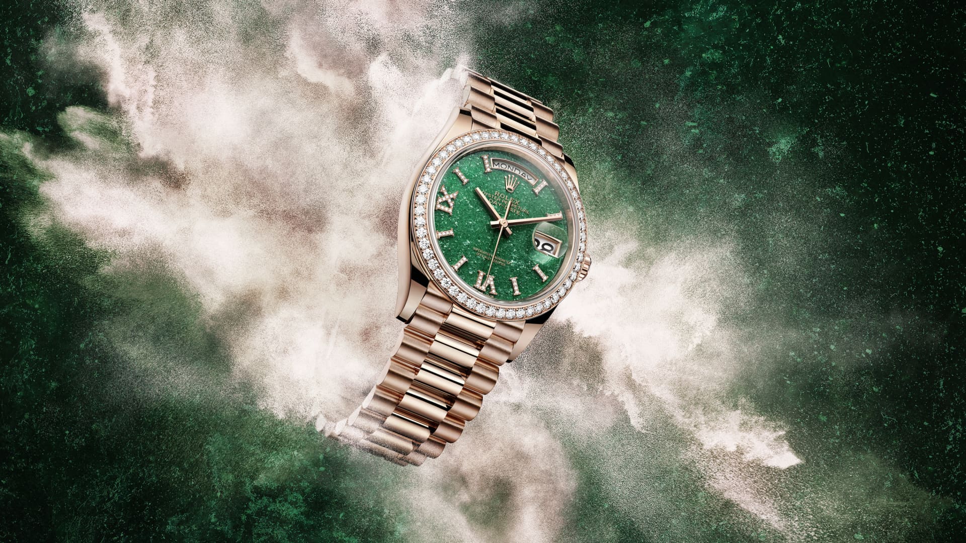 Oyster Perpetual Day-Date 36: 18-karatowe różowe złoto Everose, tarcza zielony awenturyn, wysadzana brylantami, pierścień wysadzany brylantami, bransoleta President.