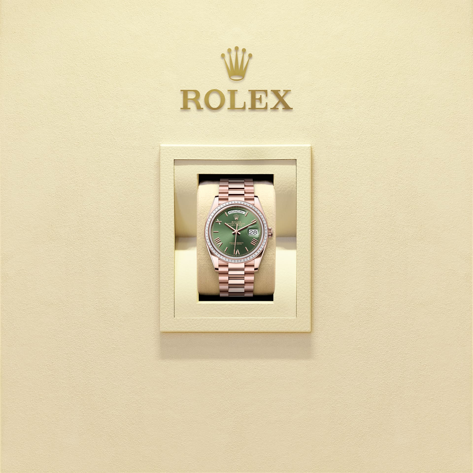 Oyster Perpetual Day-Date 36: 18-karatowe różowe złoto Everose, tarcza w kolorze oliwkowej zieleni, pierścień wysadzany brylantami i bransoleta President.