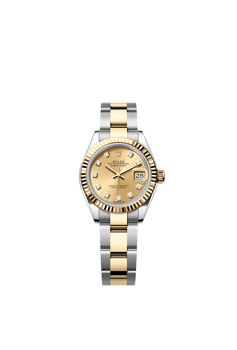 Oyster Perpetual Lady-Datejust: stal Oystersteel i żółte złoto, tarcza kolor szampana, wysadzana brylantami i bransoleta Oyster.