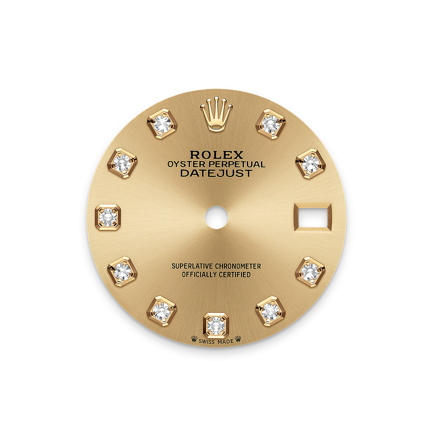 Tarcza: brylanty osadzone w 18-karatowym złocie. Szlif słoneczny zdobi subtelnymi refleksami wiele tarcz zegarków kolekcji Oyster Perpetual. Ten efekt uzyskuje się zaawansowaną techniką szczotkowania, za pomocą której powstają drobne żłobienia rozchodzące się od środka tarczy na zewnątrz.
