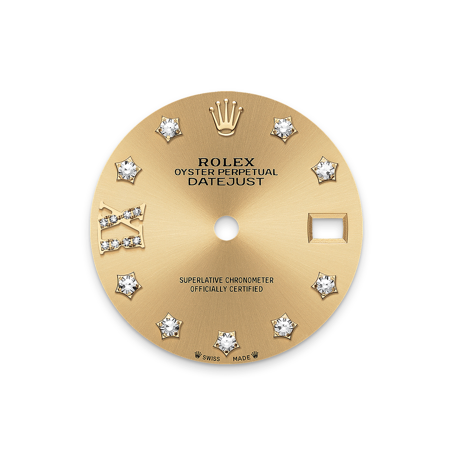 Tarcza: brylanty osadzone w 18-karatowym złocie i rzymska IX w 18-karatowym złocie wysadzana 8 brylantami. Szlif słoneczny zdobi subtelnymi refleksami wiele tarcz zegarków kolekcji Oyster Perpetual. Ten efekt uzyskuje się zaawansowaną techniką szczotkowania, za pomocą której powstają drobne żłobienia rozchodzące się od środka tarczy na zewnątrz.