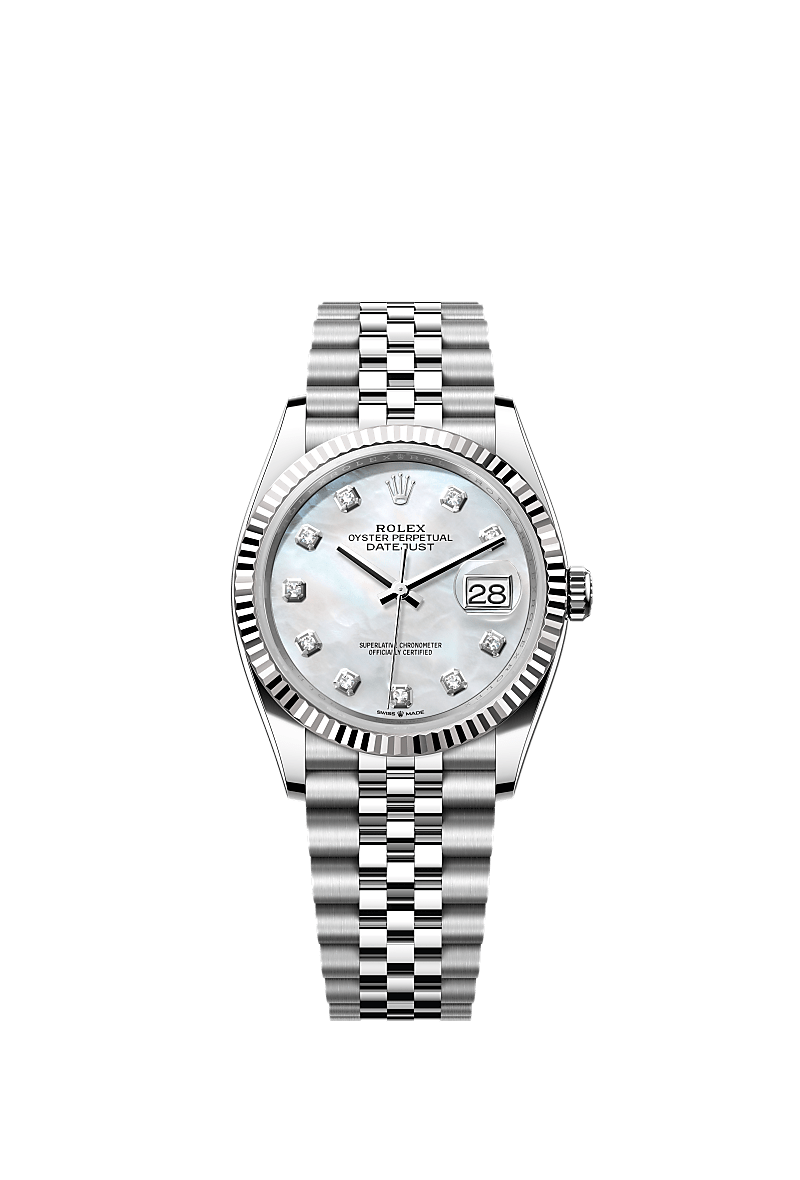 Este Oyster Perpetual Datejust 36 em aço Oystersteel e ouro branco apresenta um mostrador em madrepérola branca, cravejada de diamantes e uma pulseira Jubilee.