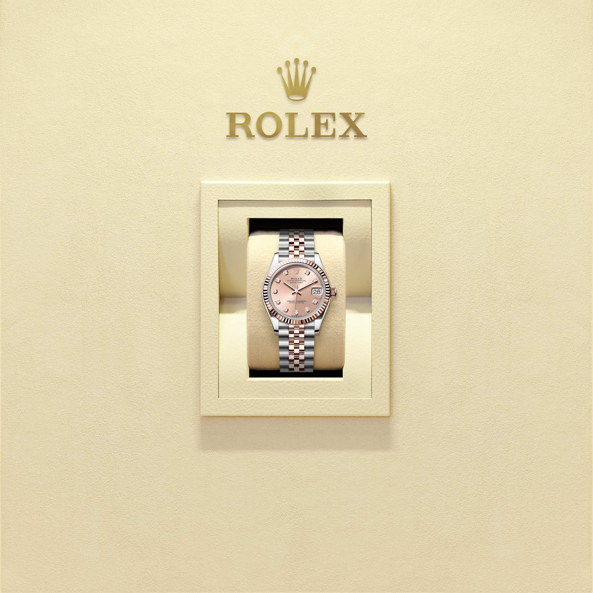 Este Oyster Perpetual Datejust 31 em aço Oystersteel e ouro Everose apresenta um mostrador cor rosé, cravejado de diamantes e uma pulseira Jubilee.