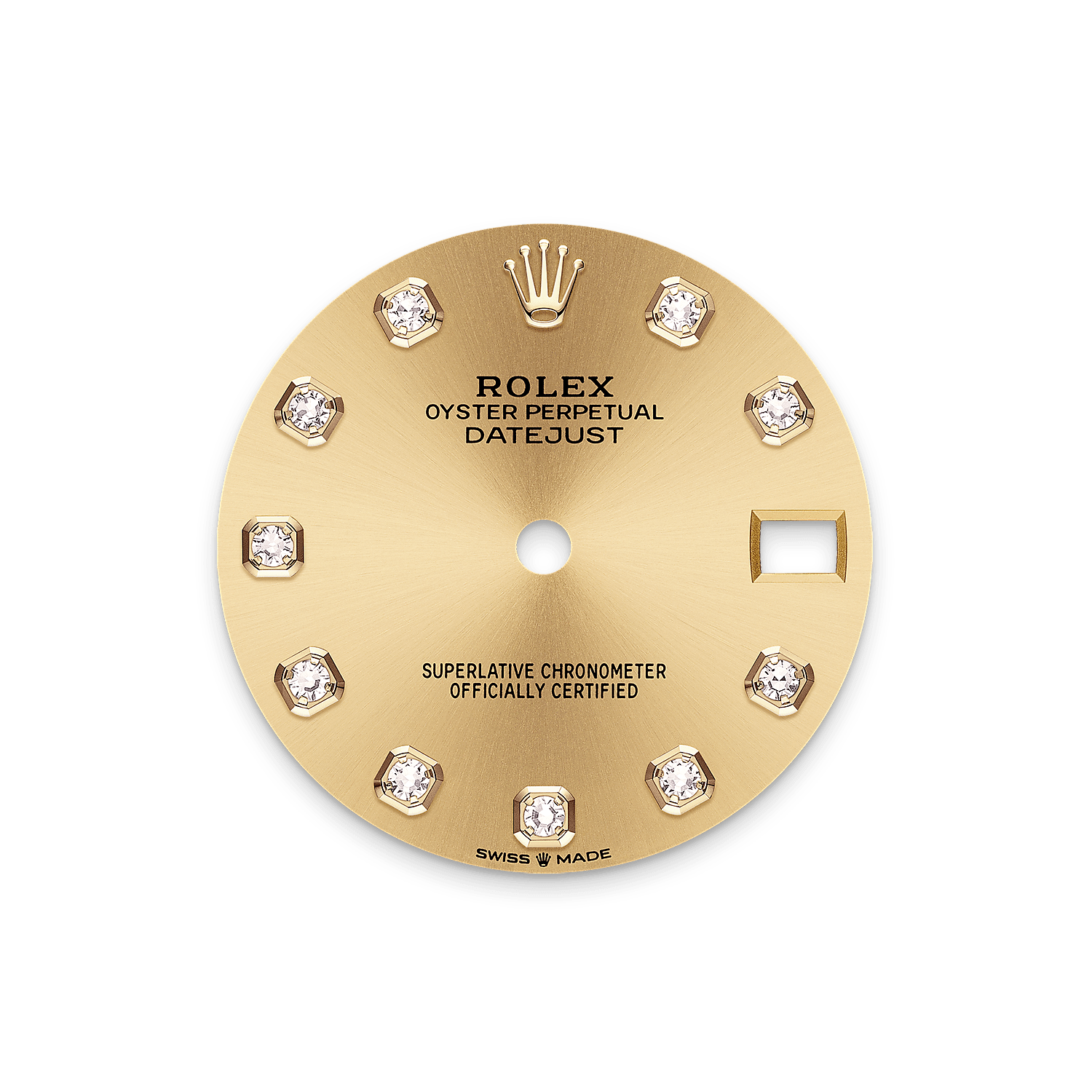 O mostrador apresenta diamantes em engastes de ouro 18 quilates. O acabamento Sun cria delicados reflexos de luz em diversos mostradores da coleção Oyster Perpetual. É obtido por meio de técnicas de escovação magistrais que criam ranhuras que vão do centro até a borda do mostrador.