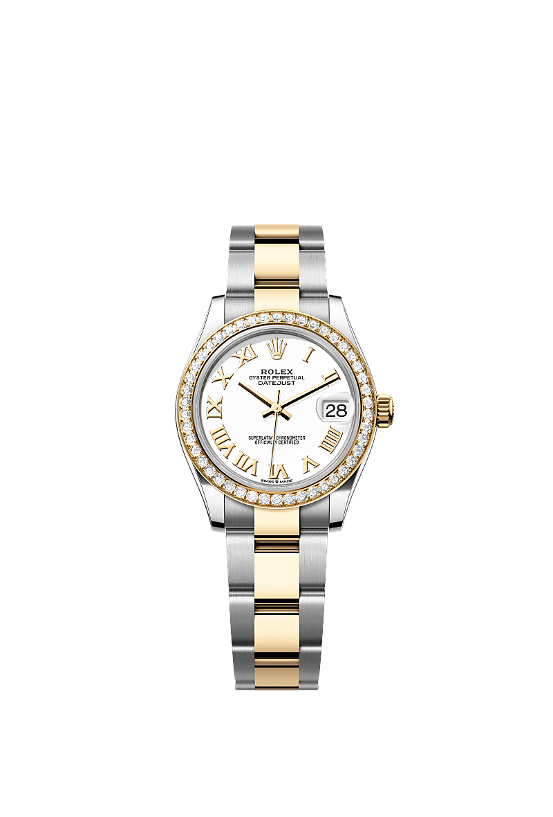 Oyster Perpetual Datejust 31 em Aço Oystersteel e ouro amarelo com mostrador branco e bracelete Oyster.