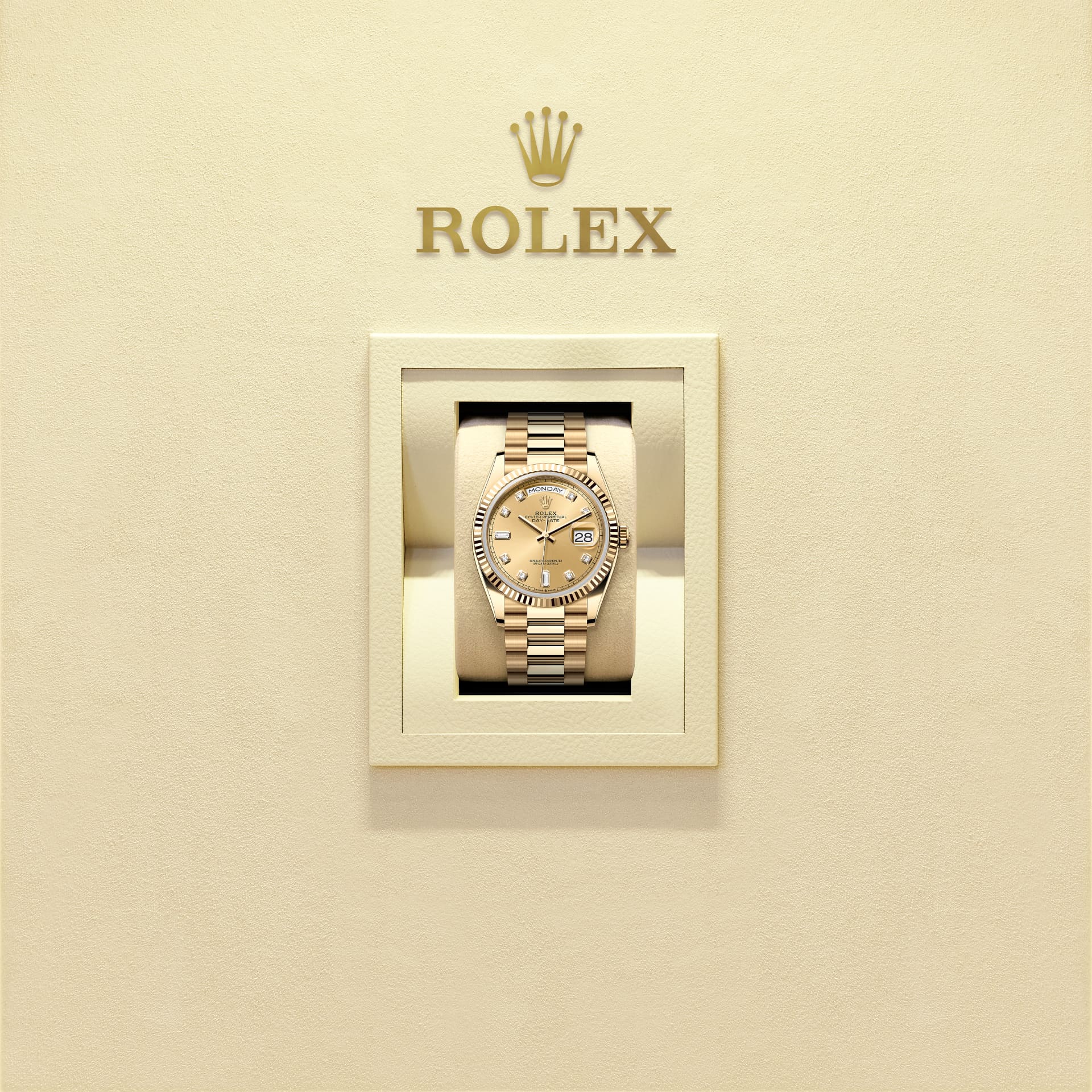 E como todos os componentes do relógio, o controle estético feito pessoalmente pelos relojoeiros Rolex garante uma beleza impecável. A pulseira President, de três fileiras de elementos semicirculares, foi criada em 1956 para o lançamento do Oyster Perpetual Day-Date. Ela representa o máximo em refinamento e conforto, e é sempre feita de metais preciosos cuidadosamente selecionados.