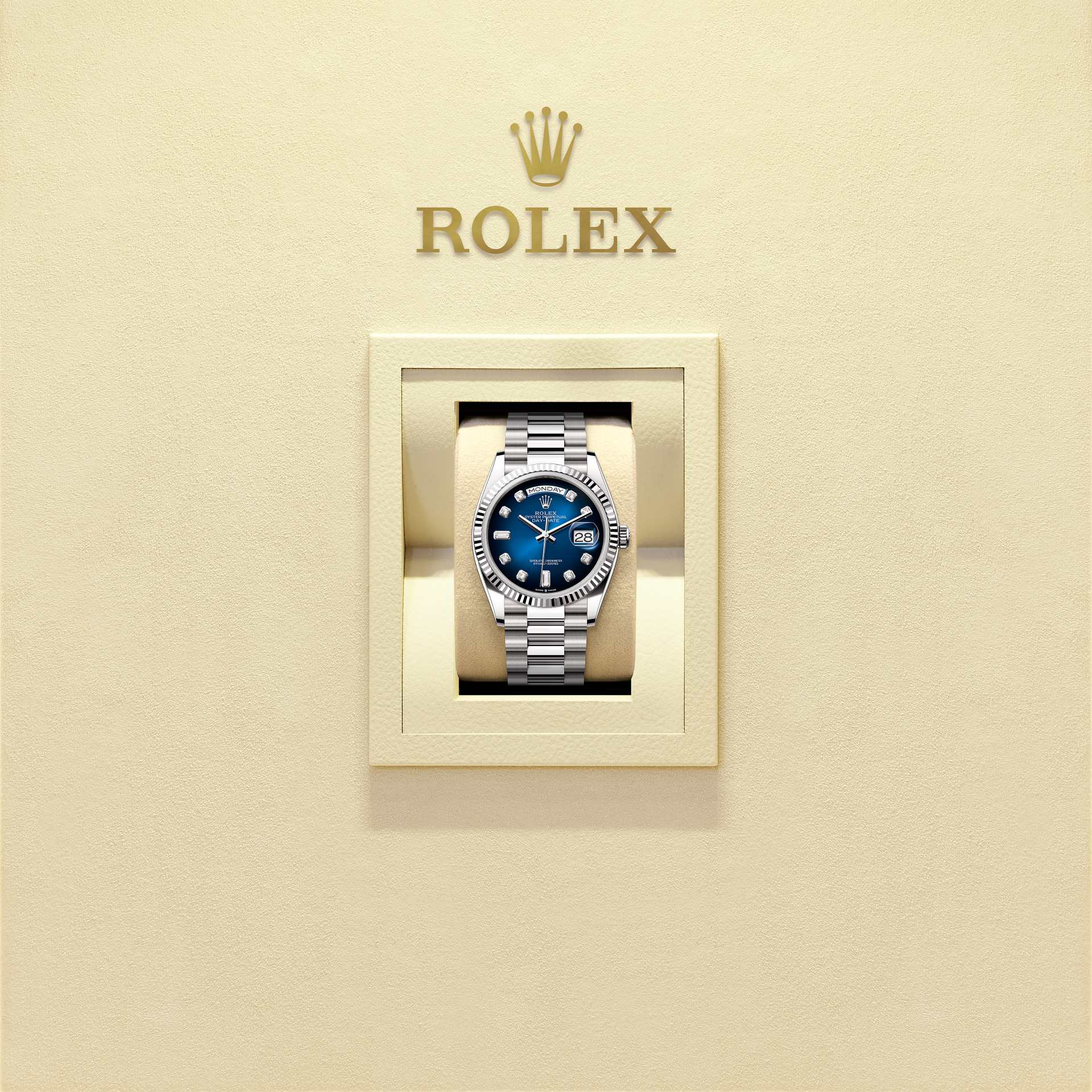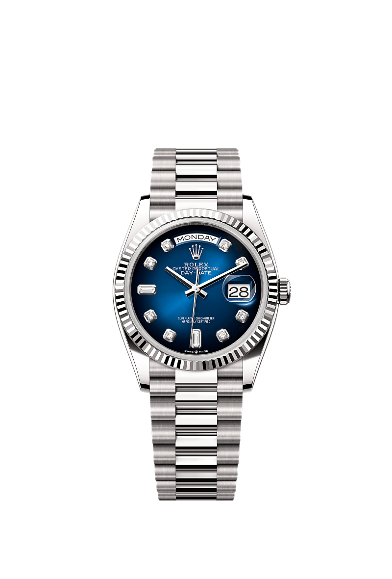Oyster Perpetual Day-Date 36 em ouro branco 18 quilates, mostrador azul ombré, cravejado de diamantes, luneta canelada e pulseira President.