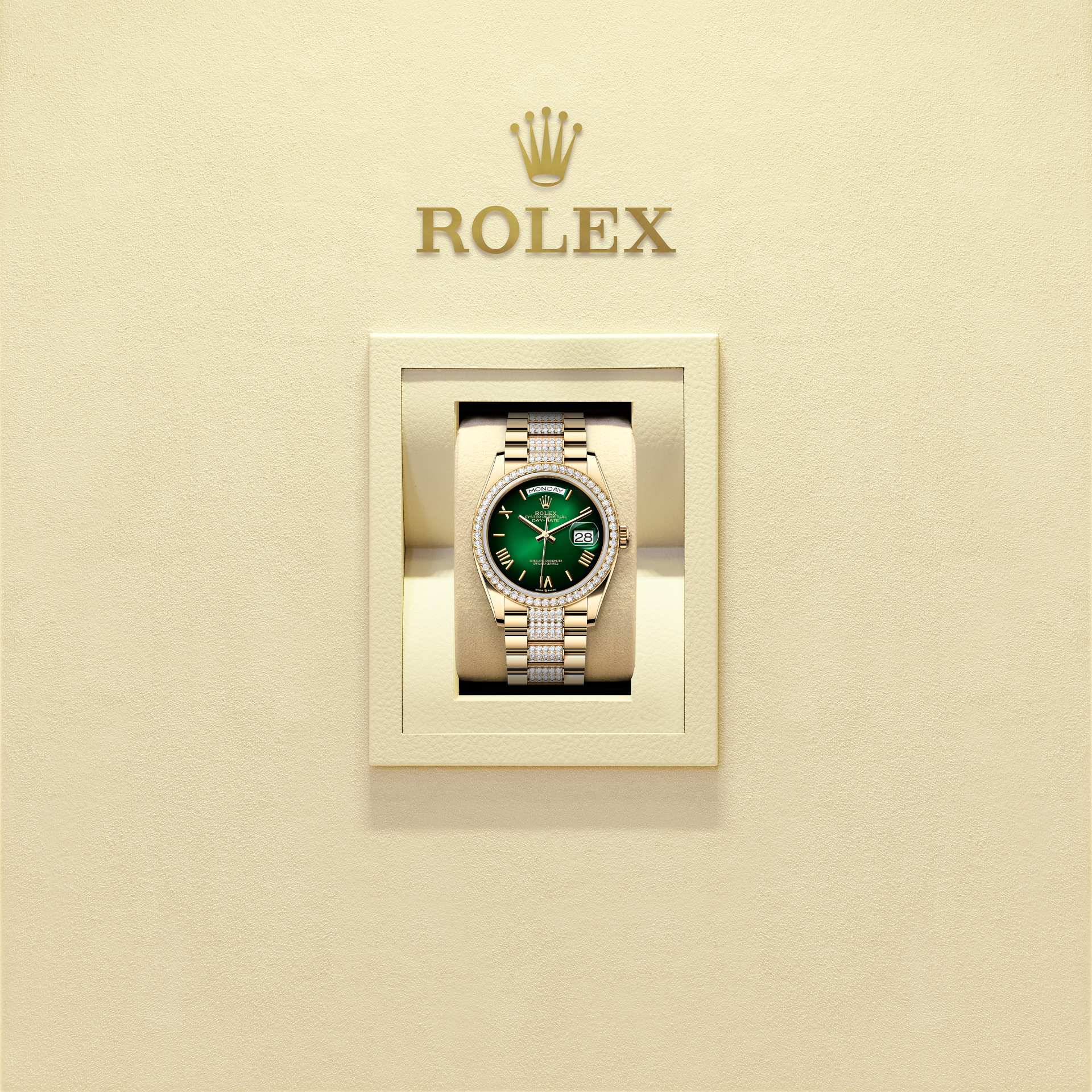 E como todos os componentes do relógio, o controle estético feito pessoalmente pelos relojoeiros Rolex garante uma beleza impecável. A pulseira President, de três fileiras de elementos semicirculares, foi criada em 1956 para o lançamento do Oyster Perpetual Day-Date. Ela representa o máximo em refinamento e conforto, e é sempre feita de metais preciosos cuidadosamente selecionados.
