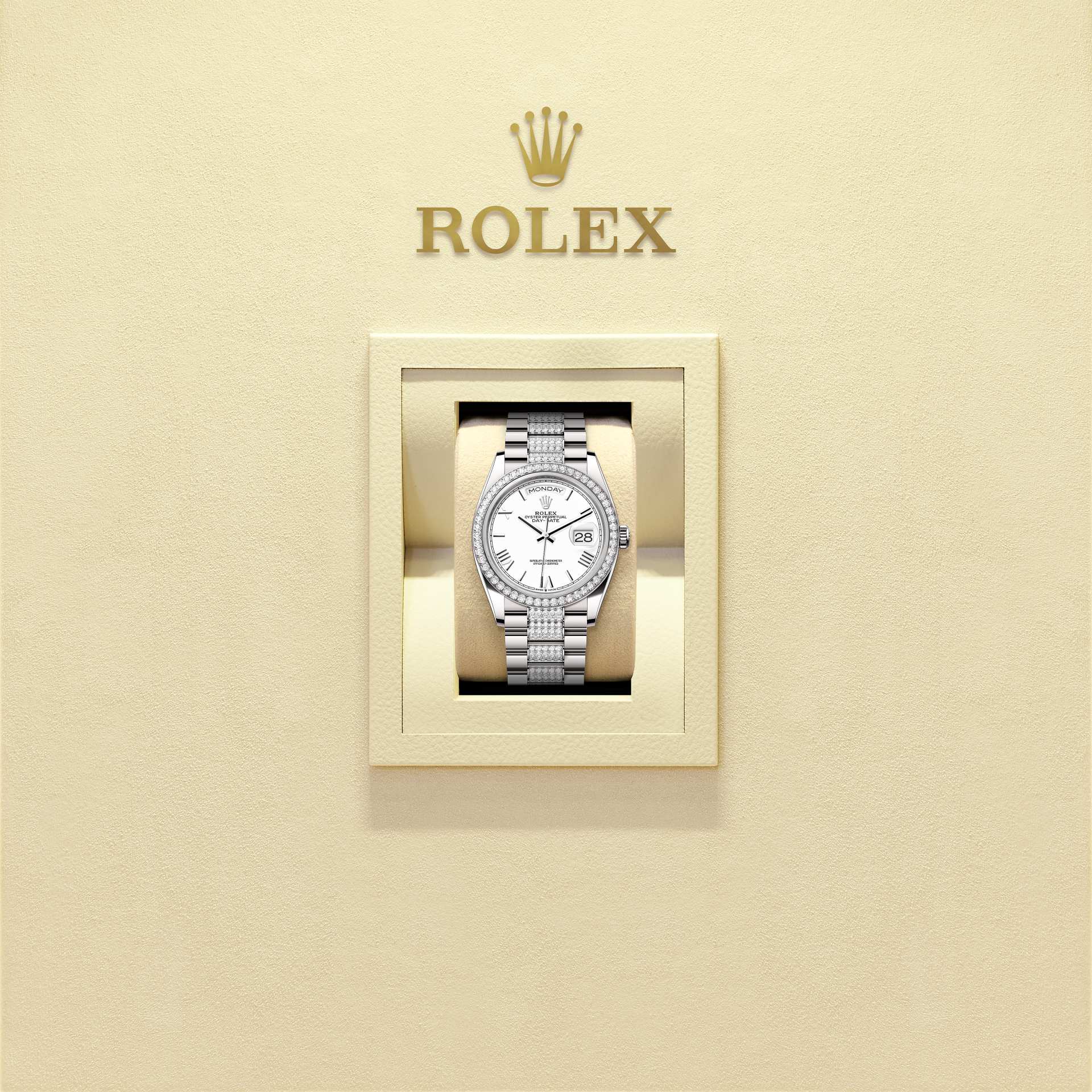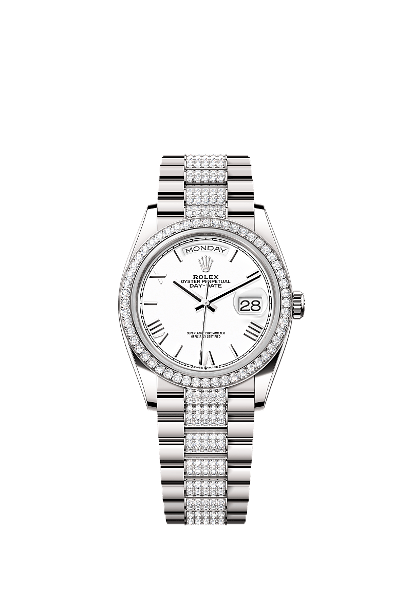 Oyster Perpetual Day-Date 36 em ouro branco 18 quilates, mostrador branco, luneta cravejada de diamantes e pulseira President cravejada de diamantes.