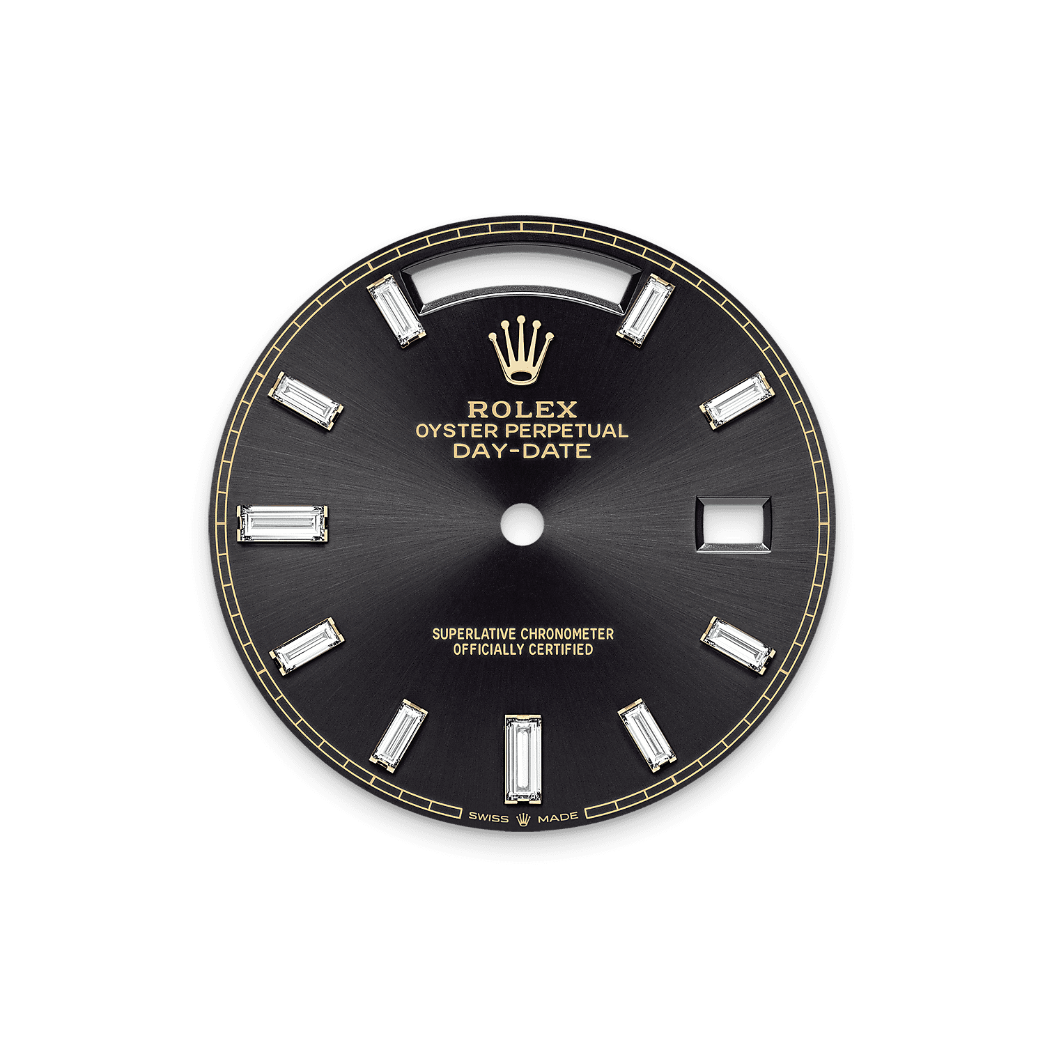 O mostrador apresenta 10 diamantes em lapidação baguette. O acabamento Sun cria delicados reflexos de luz em diversos mostradores da coleção Oyster Perpetual. É obtido por meio de técnicas de escovação magistrais que criam ranhuras que vão do centro até a borda do mostrador.