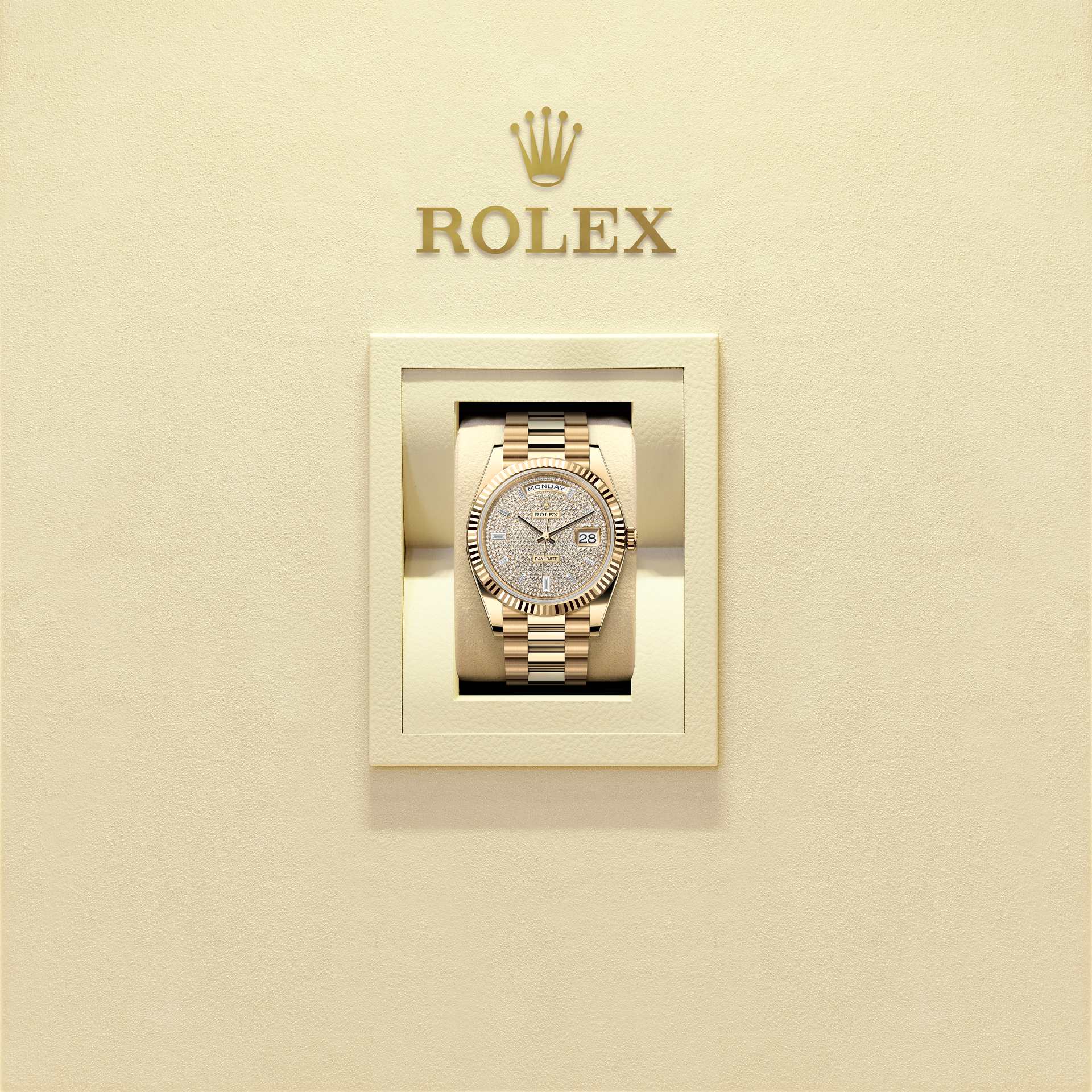 Oyster Perpetual Day-Date 40 em ouro amarelo 18 quilates, mostrador pavê de diamantes, luneta canelada e pulseira President.