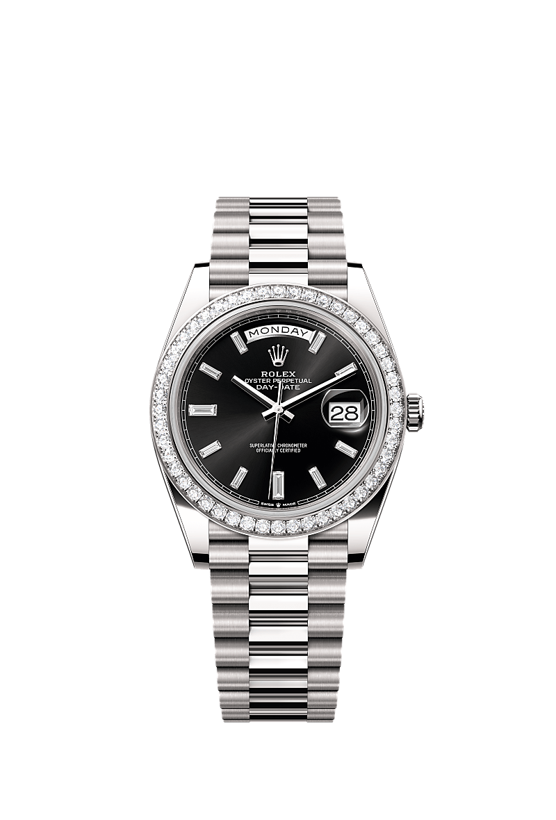 Oyster Perpetual Day-Date 40 em ouro branco 18 quilates com mostrador preto vivo, cravejado de diamantes e luneta cravejada de diamantes com pulseira President.