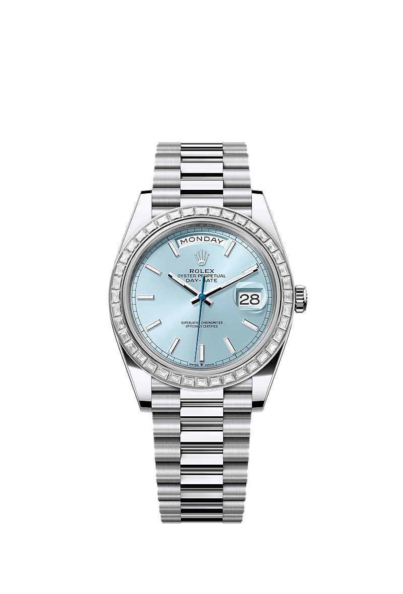 Oyster Perpetual Day-Date 40 em platina, mostrador azul glacial, luneta cravejada de diamantes e pulseira President.