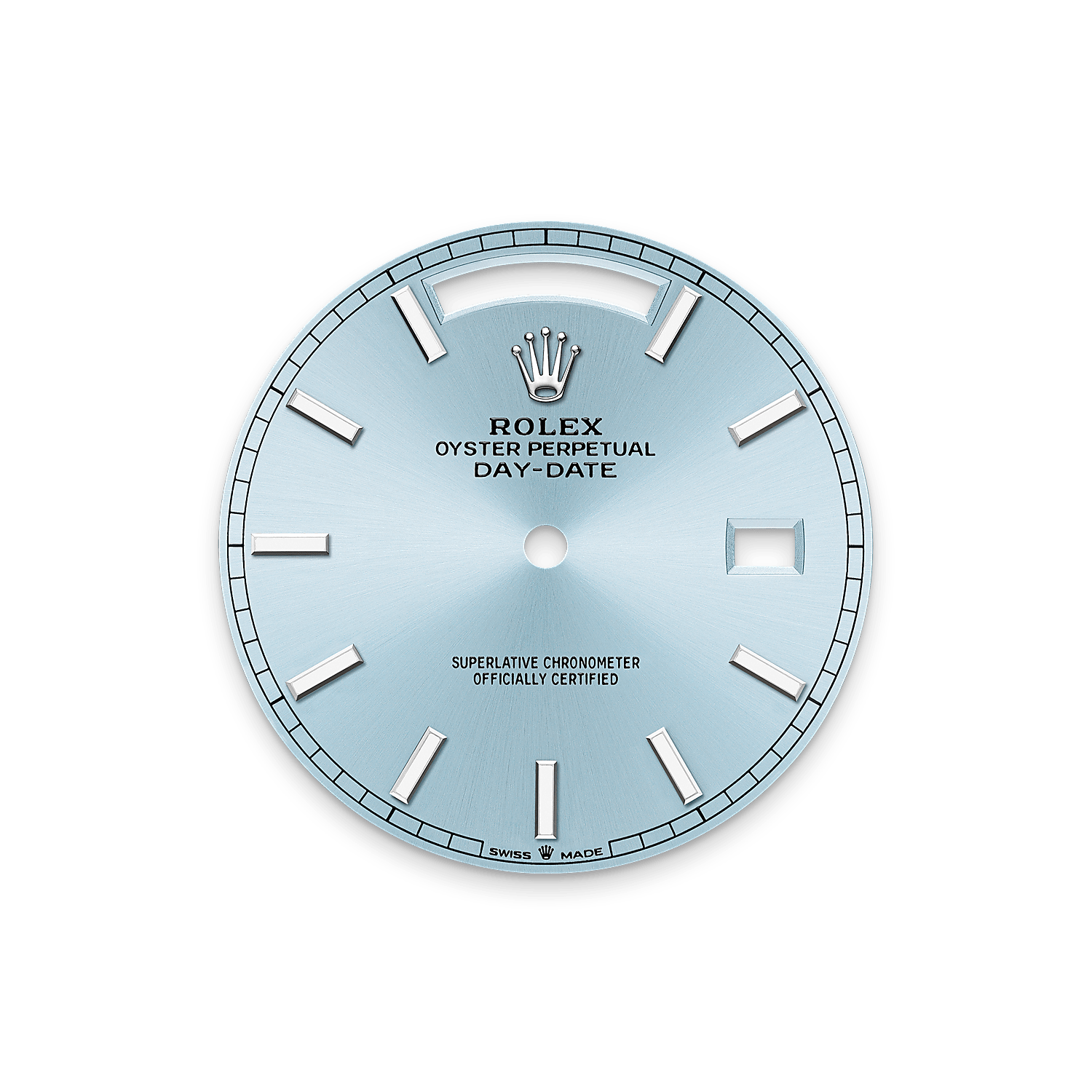 O mostrador azul-glacial é a assinatura discreta e exclusiva de um relógio Rolex em platina. A Rolex utiliza a platina, o mais nobre dos metais, para os melhores relógios.