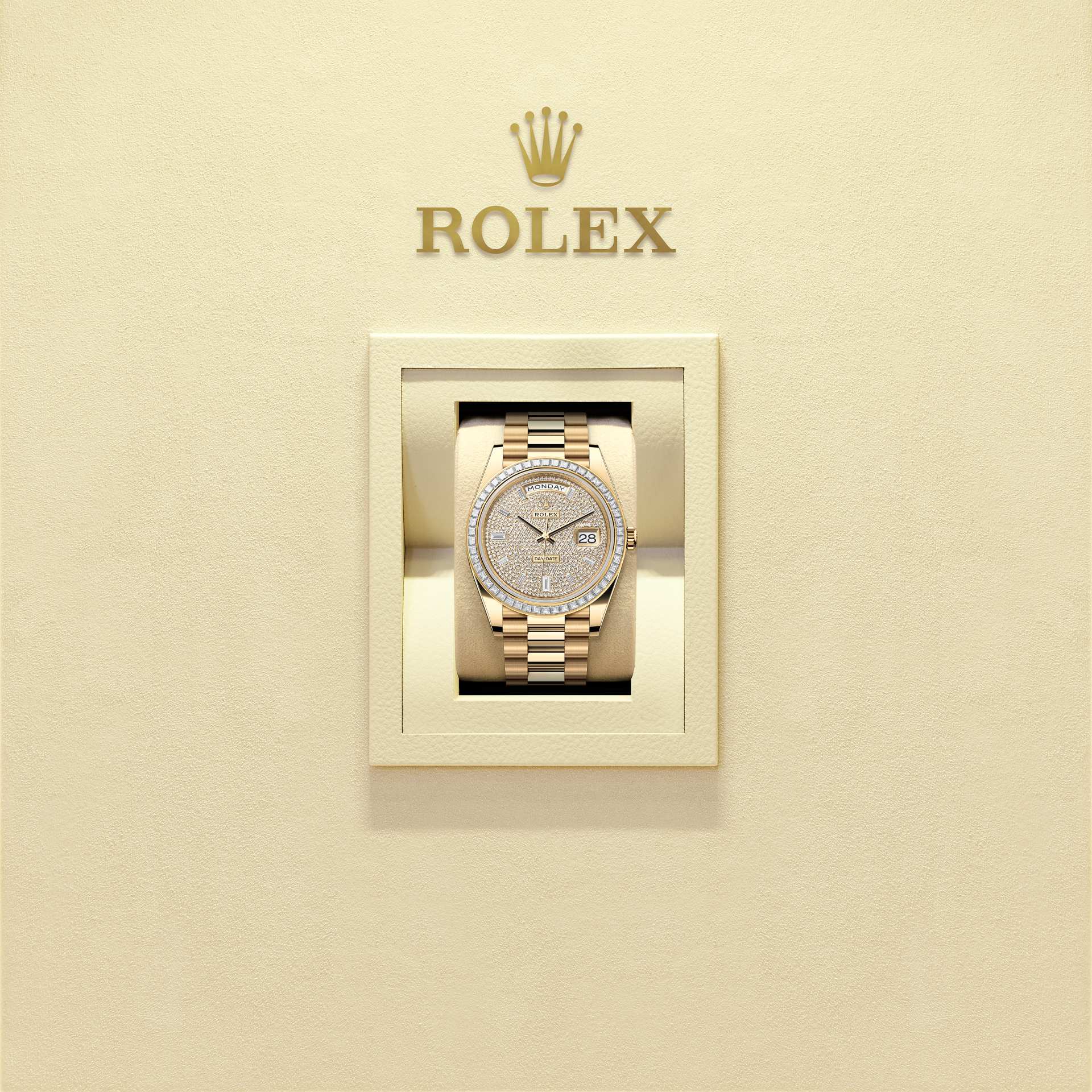 E como todos os componentes do relógio, o controle estético feito pessoalmente pelos relojoeiros Rolex garante uma beleza impecável. A pulseira President, de três fileiras de elementos semicirculares, foi criada em 1956 para o lançamento do Oyster Perpetual Day-Date. Ela representa o máximo em refinamento e conforto, e é sempre feita de metais preciosos cuidadosamente selecionados.