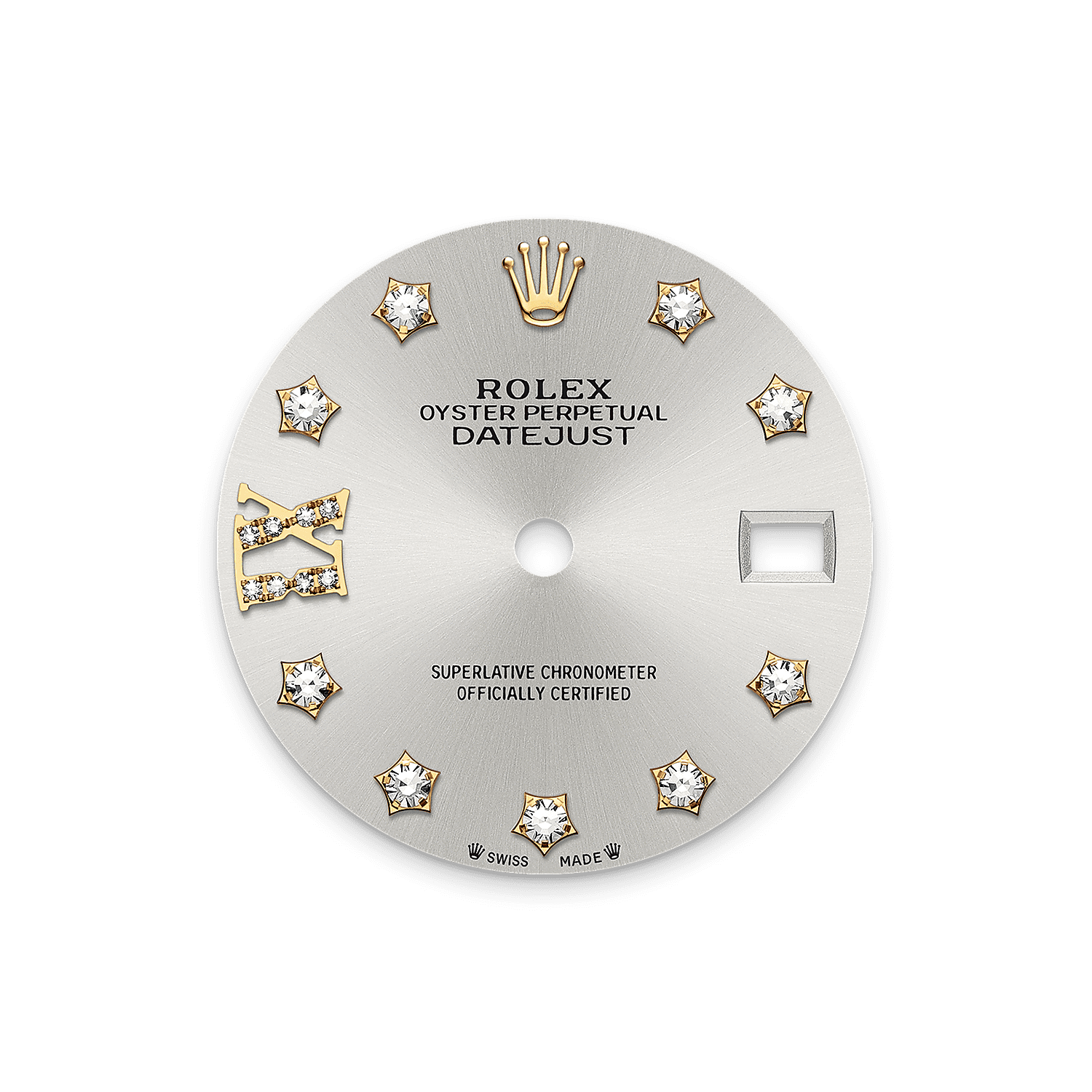 O mostrador apresenta diamantes em engastes de ouro 18 quilates e algarismo romano IX em ouro 18 quilates cravejado com 8 diamantes. O acabamento Sun cria delicados reflexos de luz em diversos mostradores da coleção Oyster Perpetual. É obtido por meio de técnicas de escovação magistrais que criam ranhuras que vão do centro até a borda do mostrador.