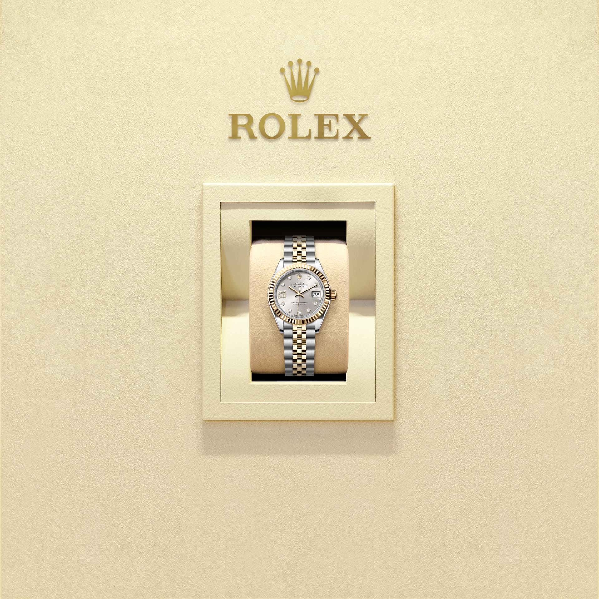 Este Oyster Perpetual Lady-Datejust em aço Oystersteel e ouro amarelo apresenta um mostrador prateado, cravejado de diamantes e uma pulseira Jubilee.