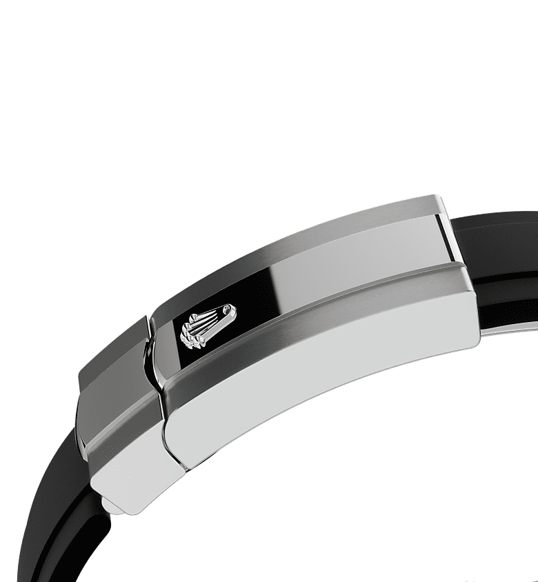 Esta lâmina está sobremoldada com um elastômero preto de alto desempenho que resiste bem às agressões ambientais, possui uma grande durabilidade e é perfeitamente inócuo para o usuário. Para aumentar o conforto, a face interna da pulseira Oysterflex contém um sistema patenteado de almofadas que estabilizam o relógio no pulso e vem com um fecho Oysterclasp em ouro branco 18 quilates. Ela também dispõe do sistema de extensão Rolex Glidelock, desenvolvido pela marca e patenteado. Esse engenhoso dispositivo de cremalheira, integrado ao fecho, permite um ajuste fino de seu comprimento — sem necessidade de nenhuma ferramenta — em cerca de 15 mm, por estágios de aproximadamente 2,5 mm.