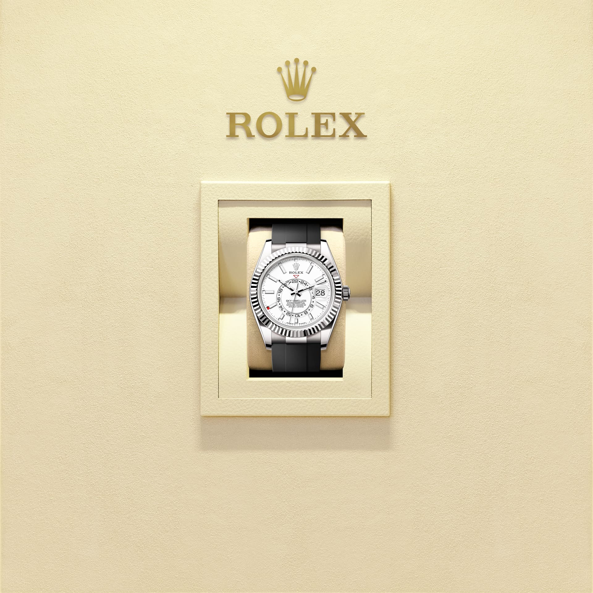 Oyster Perpetual Sky-Dweller em ouro branco 18 quilates com mostrador branco intenso e pulseira Oysterflex.