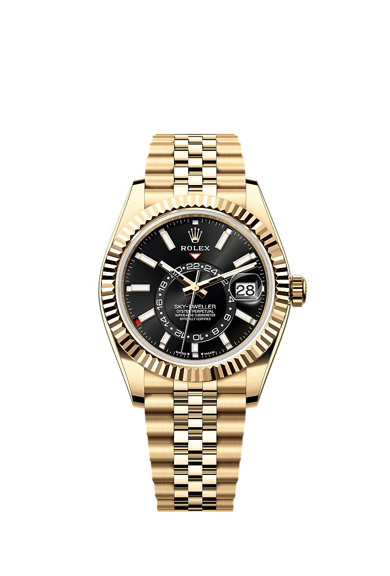 Oyster Perpetual Sky-Dweller em ouro amarelo 18 quilates com mostrador preto vivo e pulseira Jubilee.