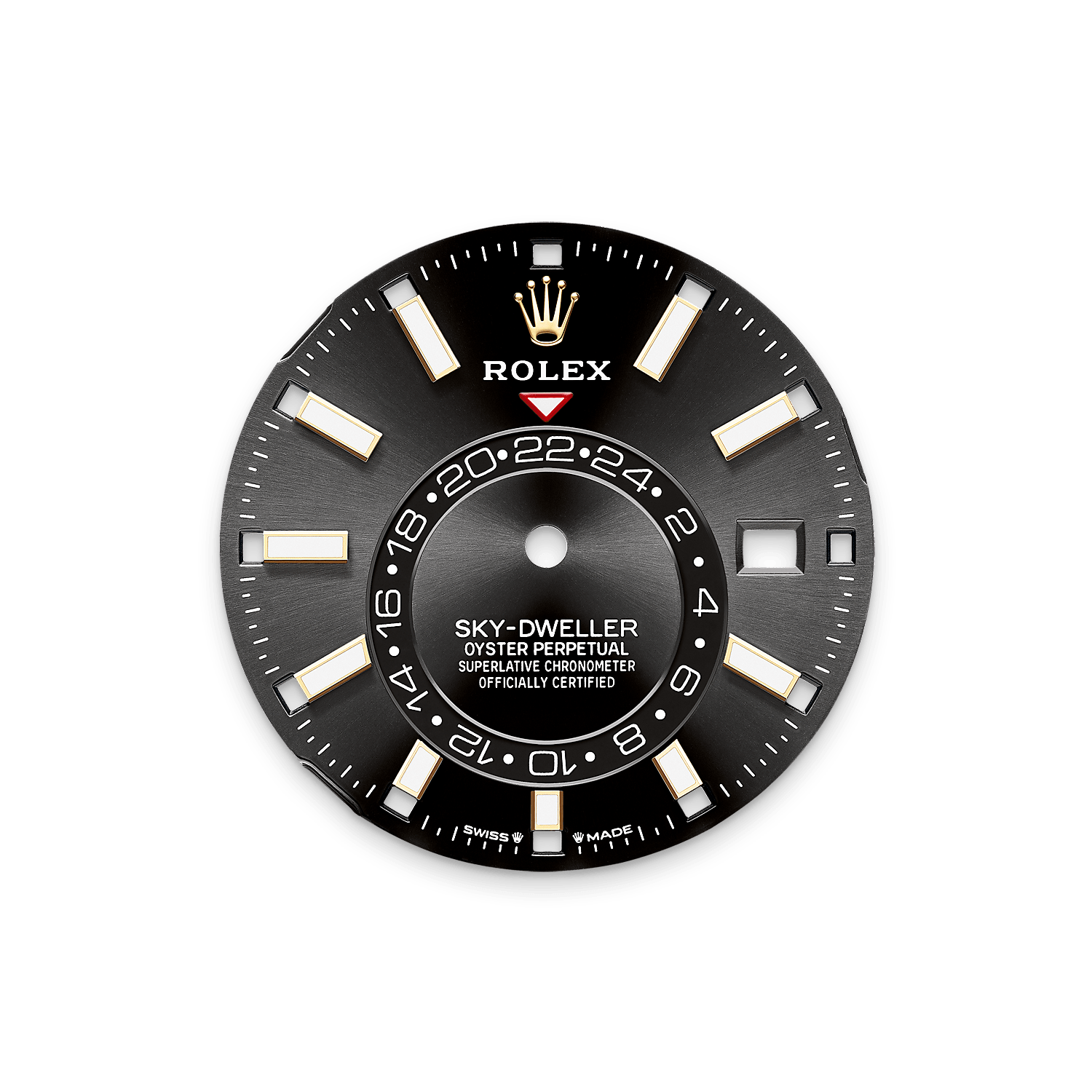 O triângulo vermelho invertido do mostrador aponta para a hora de referência escolhida — a hora local ou a hora do local de trabalho do viajante — na exibição 24 horas por disco sobre o mostrador. Esta exibição 24 horas distingue imediatamente as horas do dia e da noite em outros fusos horários.