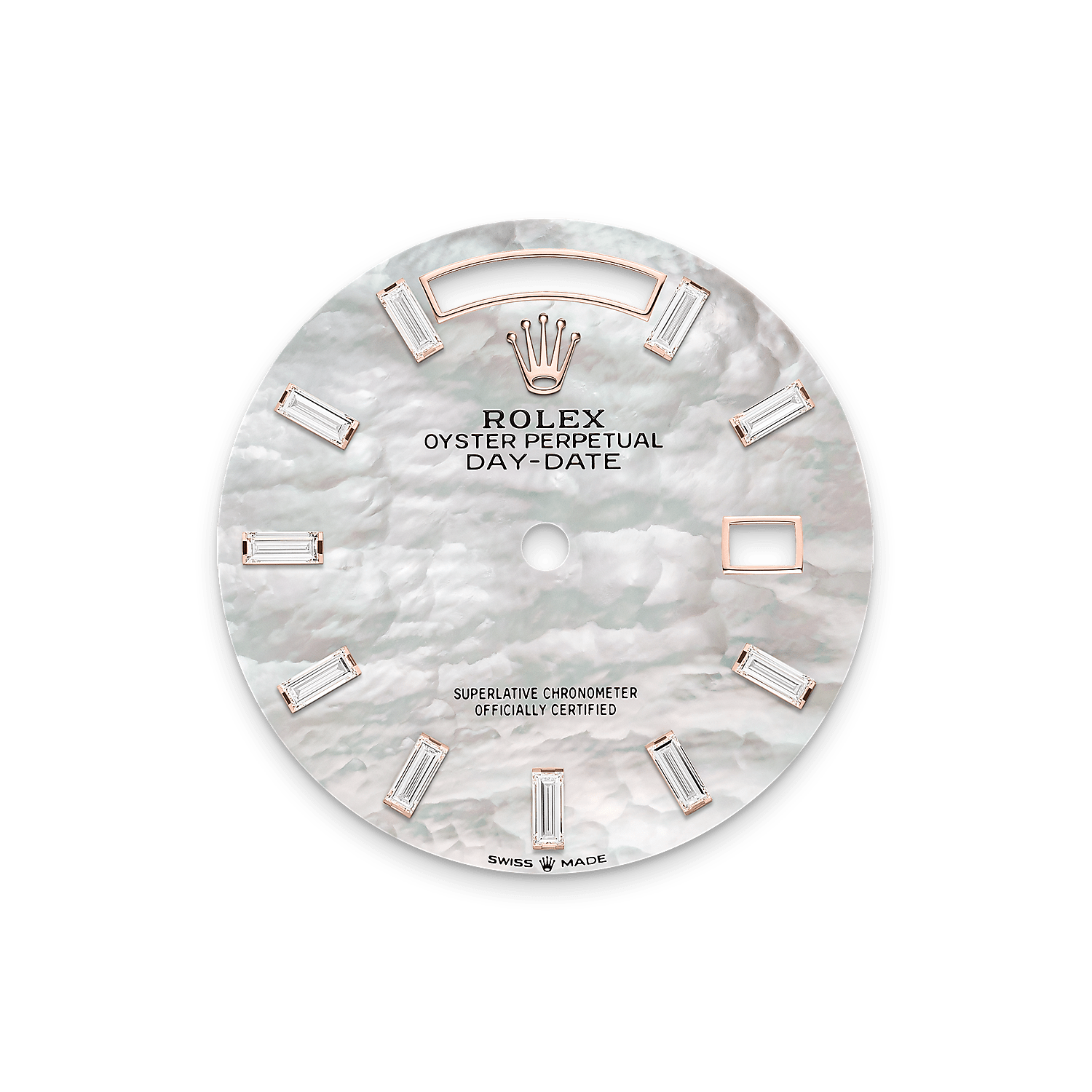 Rolex никогда не практикует искусственное окрашивание перламутра. Применение специальных техник позволяет подчеркнуть его природную красоту и натуральные оттенки. Каждый перламутровый циферблат уникален — не существует двух одинаковых циферблатов из перламутра.