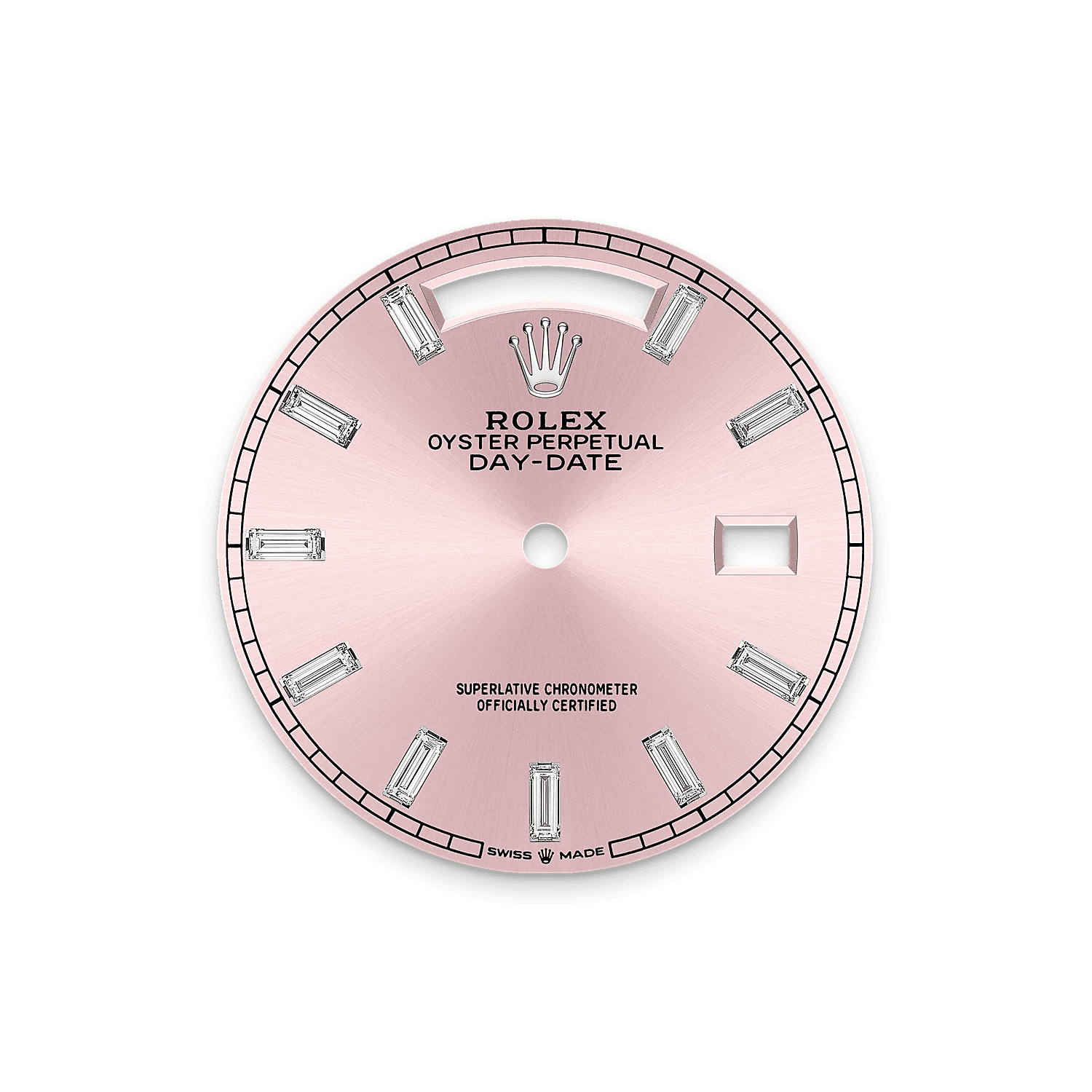 Характеристики модели: циферблат: 10 бриллиантов багетной огранки. Эффект солнечного перелива создает мягкие световые отражения на циферблатах часов коллекции Oyster Perpetual. Это достигается путем мастерской техники сатинирования, создающей бороздки, идущие от центра циферблата в стороны.