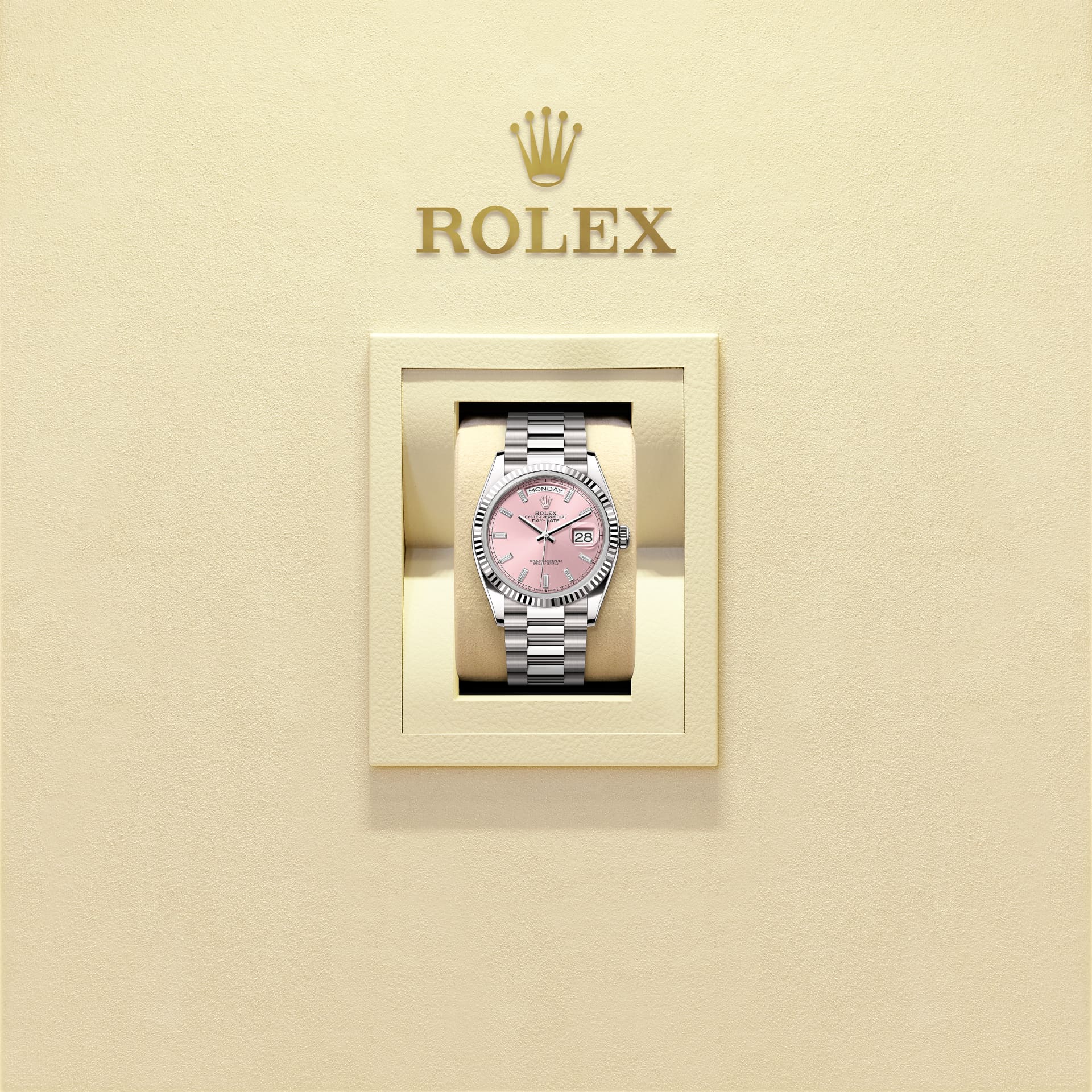 Часы Oyster Perpetual Day-Date 36, 18-каратное белое золото; циферблат: розовый, бриллианты; безель: рифленый; браслет: President.