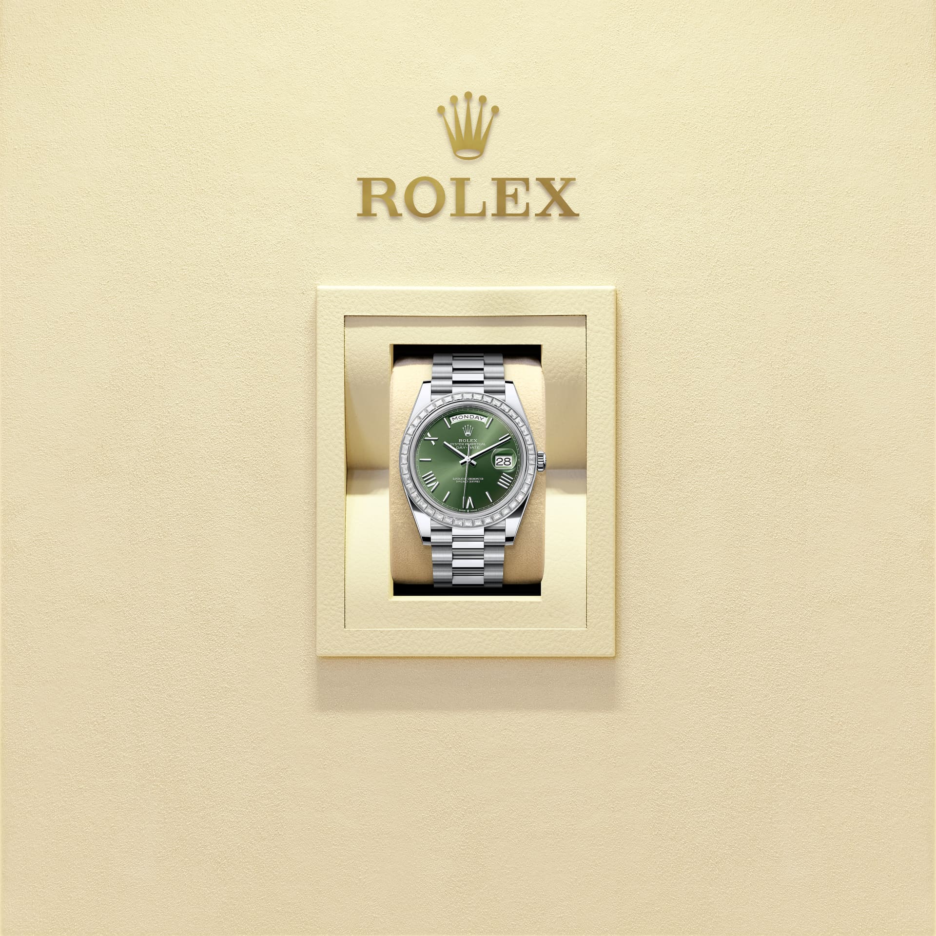Часы Oyster Perpetual Day-Date 40, платина; циферблат: оливкового цвета; безель: бриллианты; браслет: President.