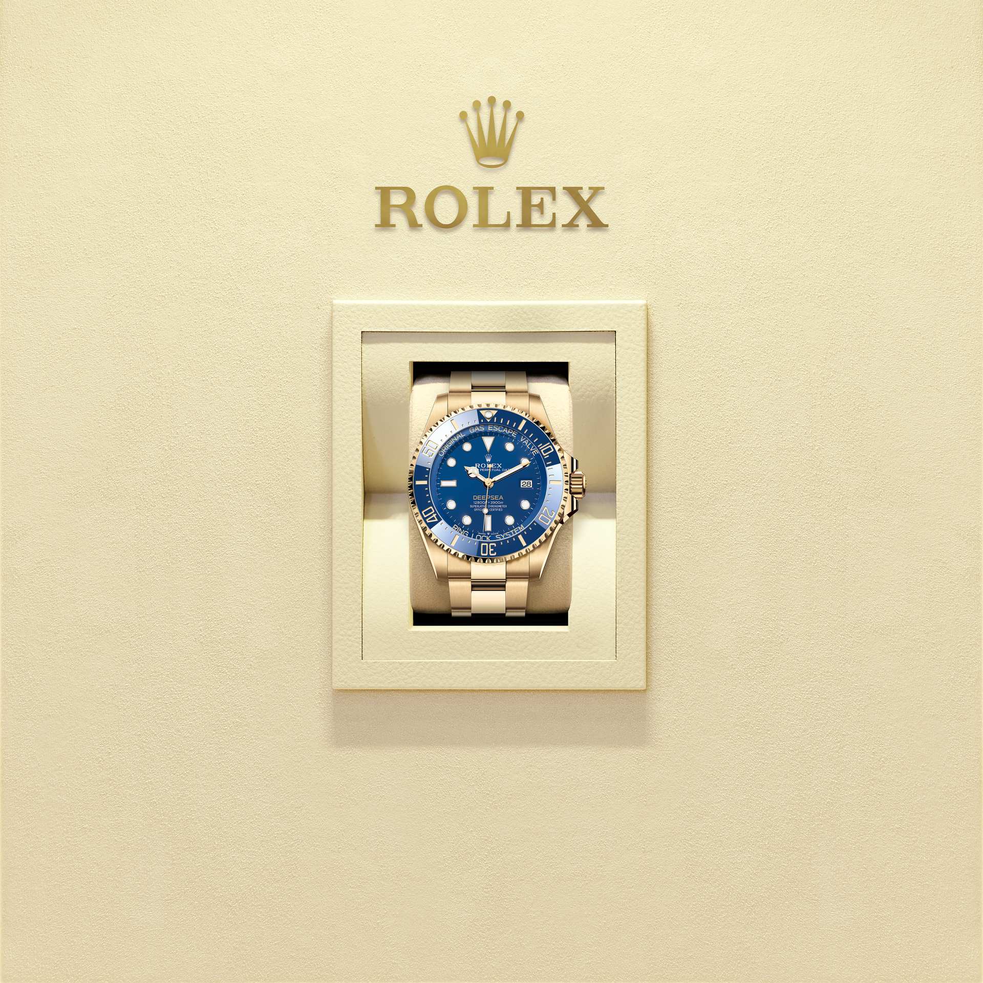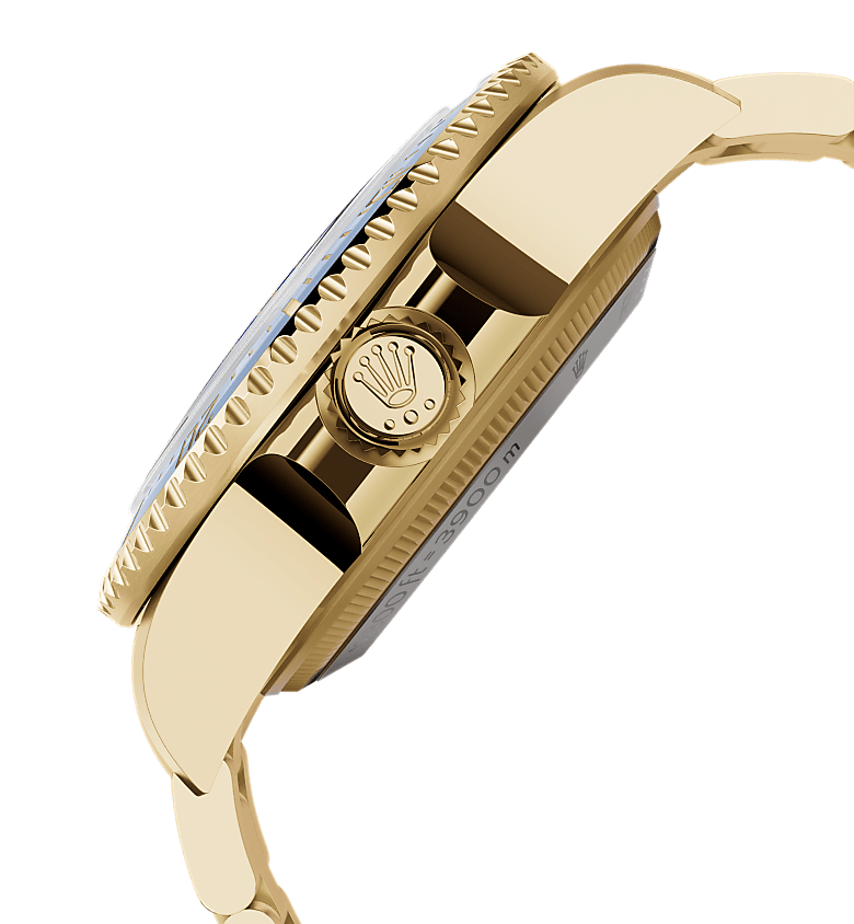 Сочетание синих оттенков компрессионного кольца, циферблата и диска безеля Cerachrom напоминает океанскую палитру цветов, озаренную блеском 18‑каратного желтого золота, из которого выполнены корпус и браслет Oyster.