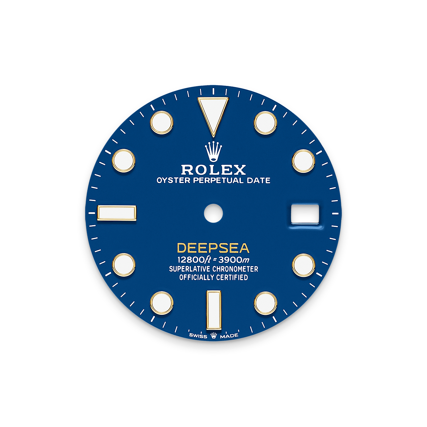 Лакированный синий циферблат с пудровой желтой надписью «DEEPSEA». На циферблате выделяются крупные указатели и стрелки Chromalight, на которые нанесено люминесцентное вещество с голубым свечением долгого действия, обеспечивающее прекрасную видимость в темноте.