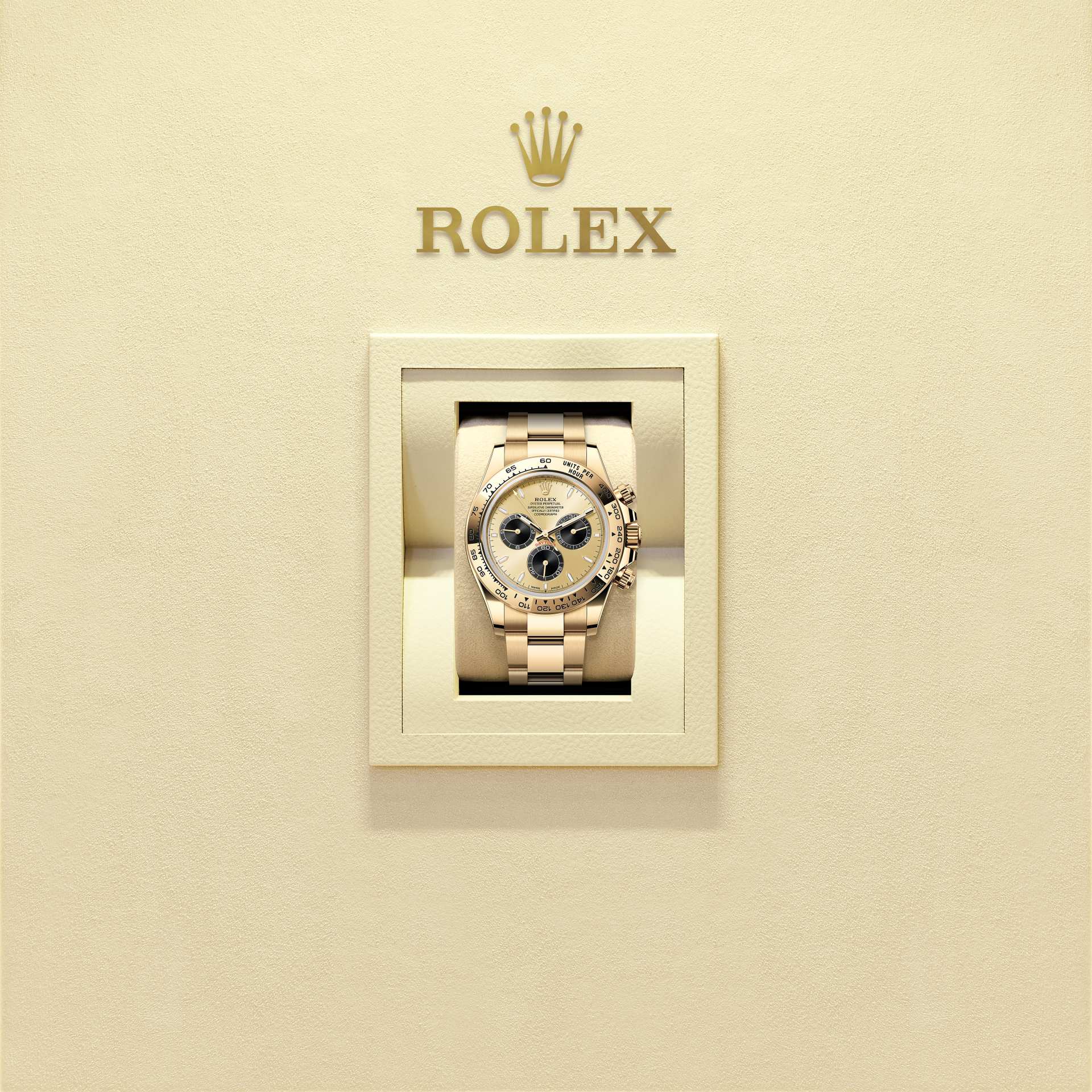 Oyster Perpetual Cosmograph Daytona รุ่นวัสดุทองคำ 18 กะรัต มาพร้อมหน้าปัด สีทองและดำสว่าง และสายนาฬิกา Oyster พร้อมด้วยขอบตัวเรือน ทองคำ 18 กะรัตที่มาพร้อมการสลักสเกลวัดความเร็ว