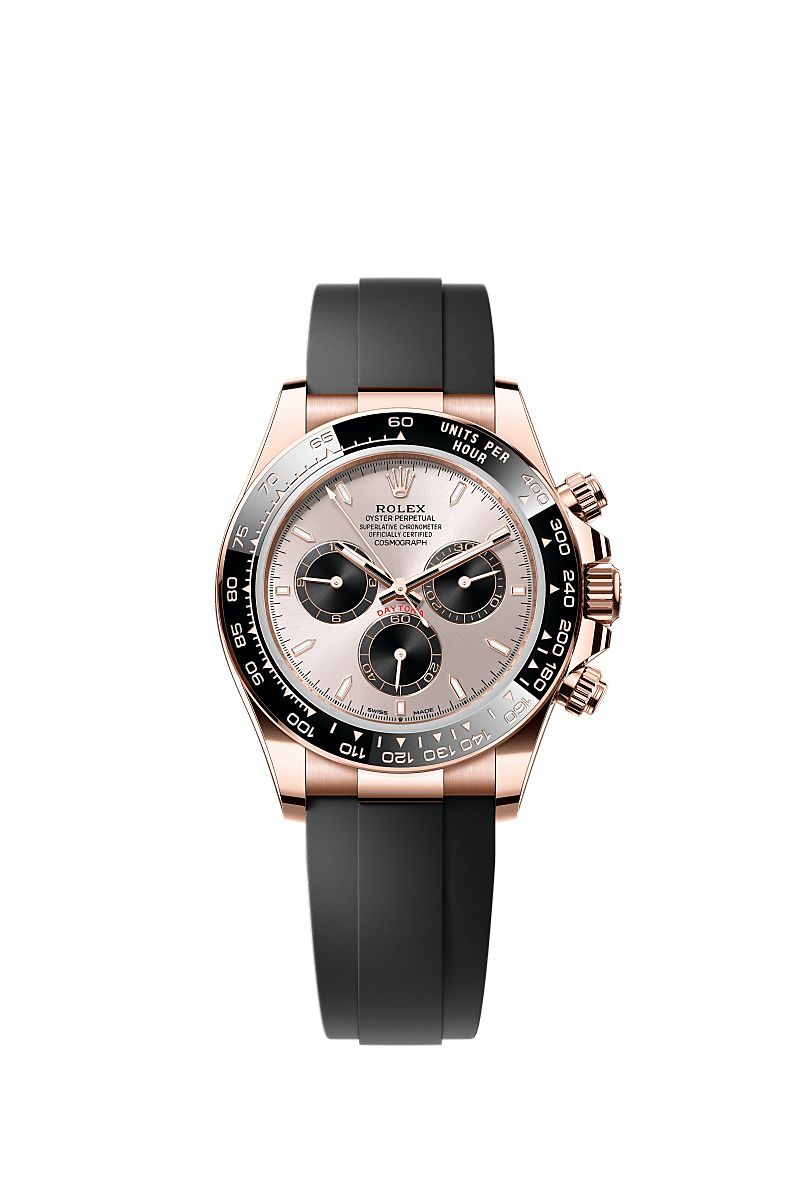 Oyster Perpetual Cosmograph Daytona รุ่นวัสดุEverose gold 18 กะรัต มาพร้อมหน้าปัด ซันดัสท์และสีดำสว่าง และสายนาฬิกา Oysterflex พร้อมด้วยขอบตัวเรือน Cerachrom สีดำที่มาพร้อมสเกลวัดความเร็ว