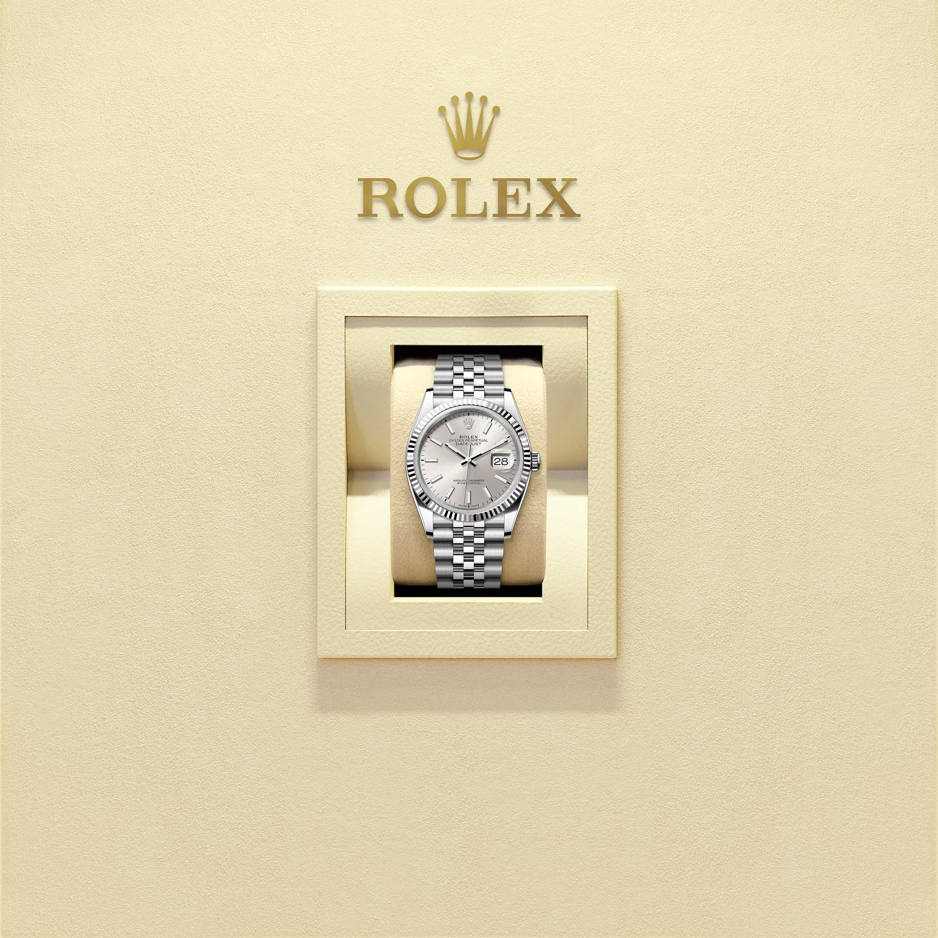 Oyster Perpetual Datejust 36 ทำจากOystersteel และทองคำขาว โดดเด่นด้วยหน้าปัดเงิน และสาย Jubilee