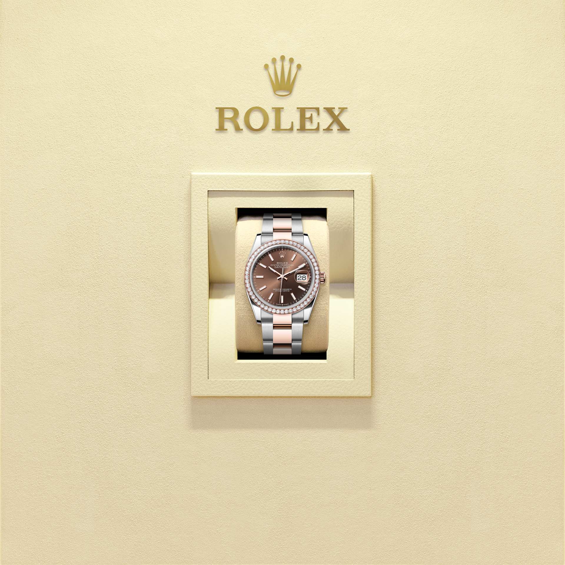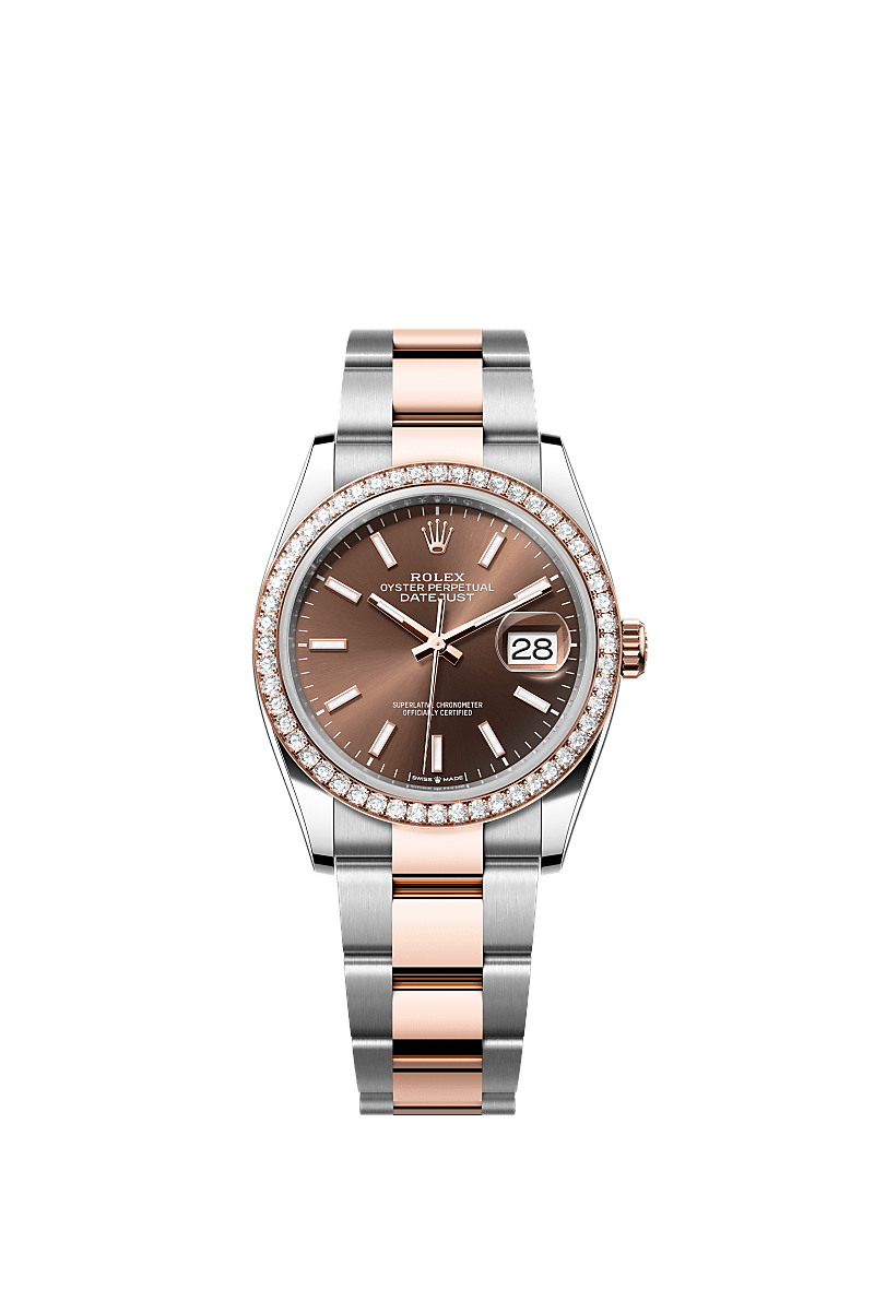 Oyster Perpetual Datejust 36 ทำจากOystersteel และเอเวอร์โรสโกลด์ โดดเด่นด้วยหน้าปัดสีช็อกโกแลต และสาย Oyster