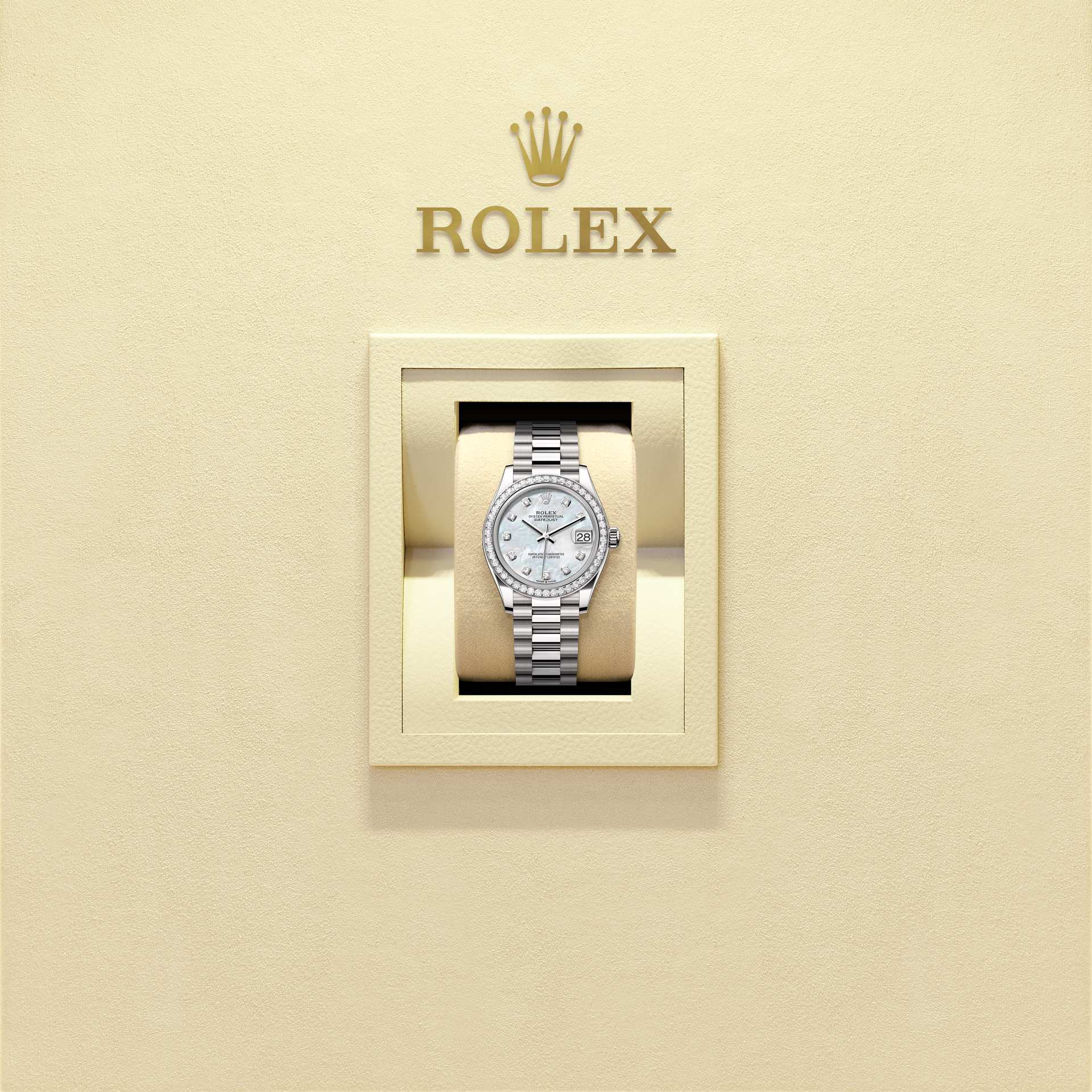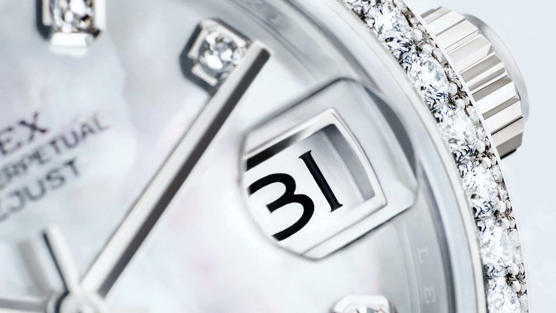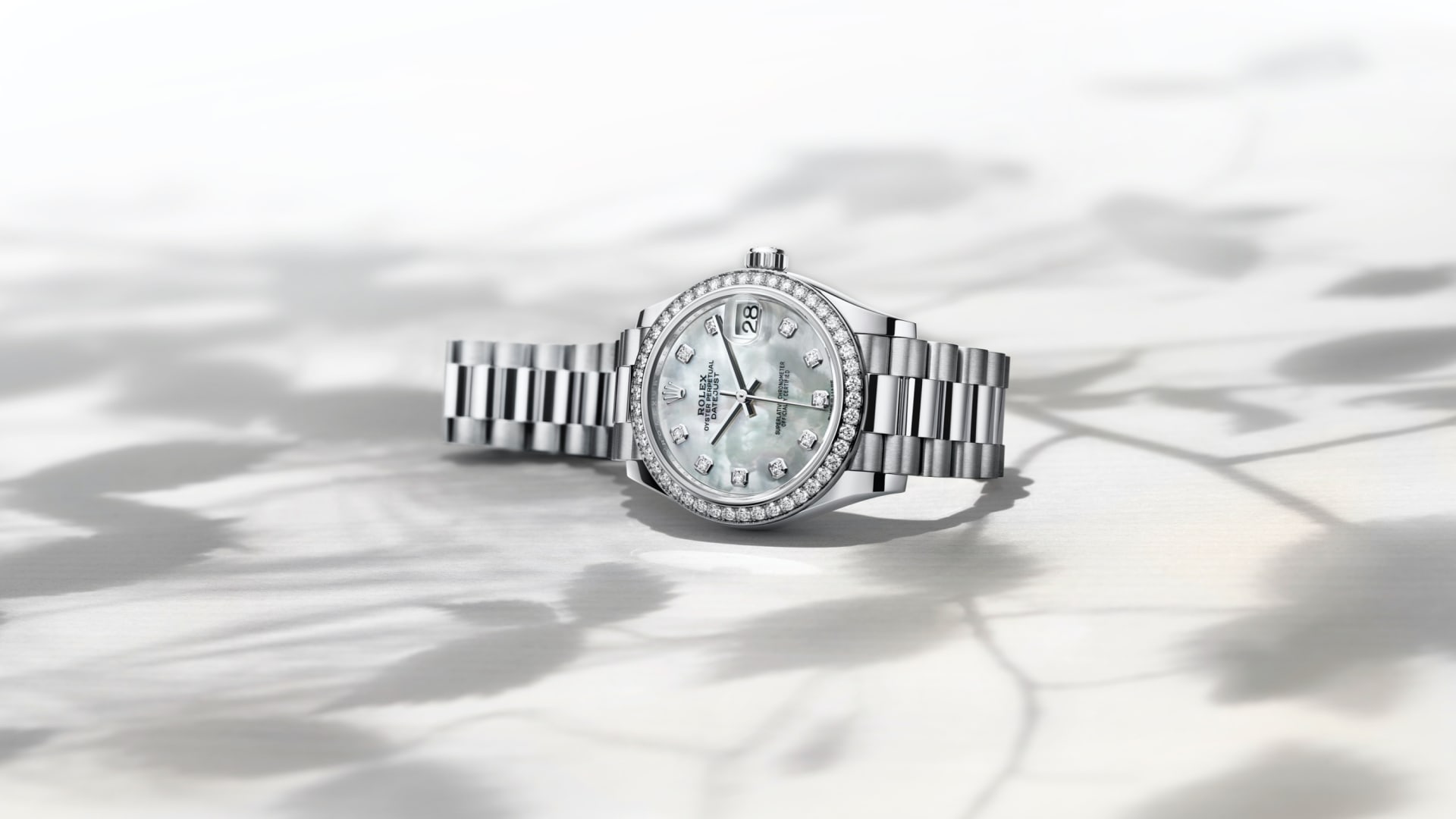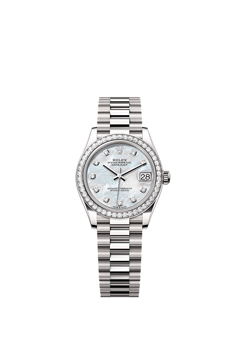 Oyster Perpetual Datejust 31 ทำจากทองคำขาว 18 กะรัต โดดเด่นด้วยหน้าปัดเปลือกหอยมุกสีขาว ประดับเพชร และสาย President
