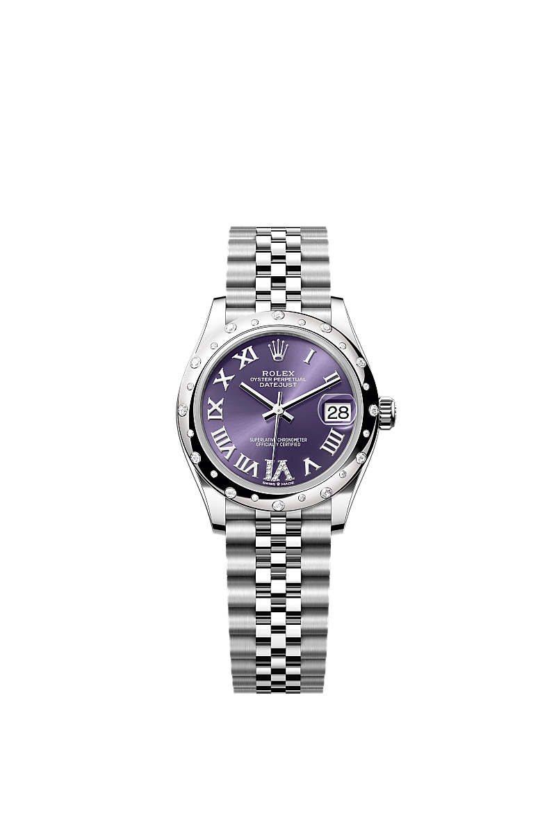 Oyster Perpetual Datejust 31 ทำจากOystersteel และทองคำขาว โดดเด่นด้วยหน้าปัดสีม่วงเข้มประดับเพชร และสาย Jubilee