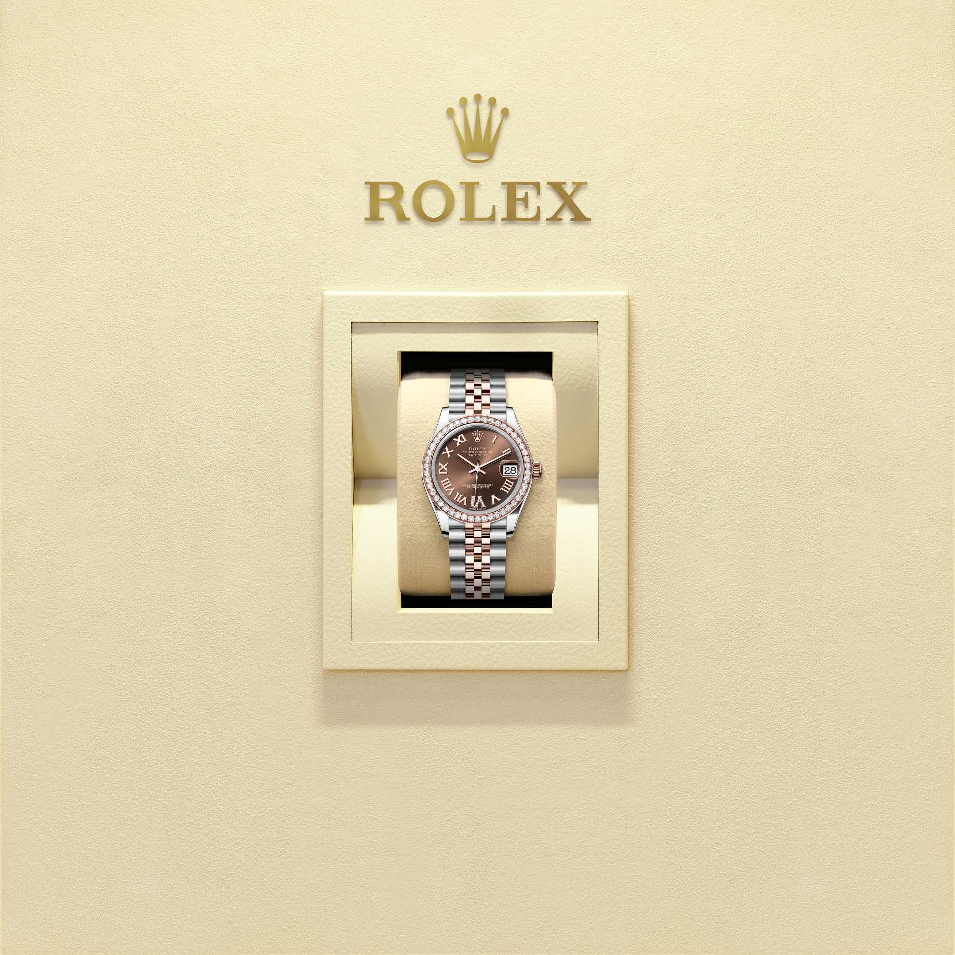 Oyster Perpetual Datejust 31 ทำจากOystersteel และ Everose gold โดดเด่นด้วยหน้าปัดสีช็อกโกแลต ประดับเพชร และสาย Jubilee