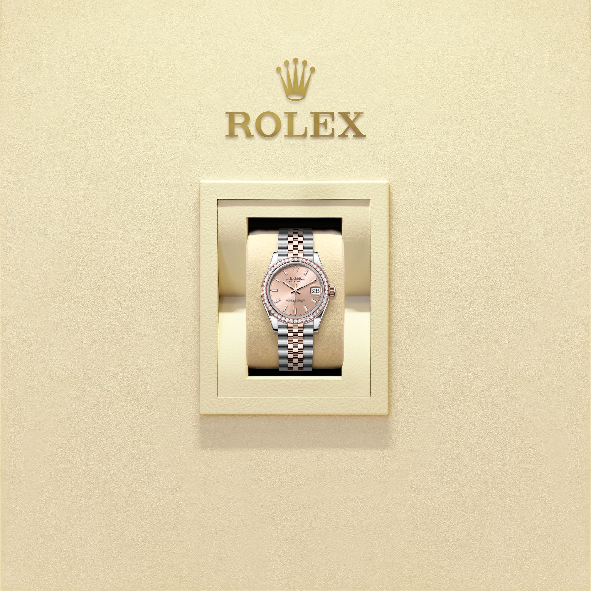 Oyster Perpetual Datejust 31 ทำจากOystersteel และเอเวอร์โรสโกลด์ โดดเด่นด้วยหน้าปัดสีชมพูกุหลาบ และสาย Jubilee