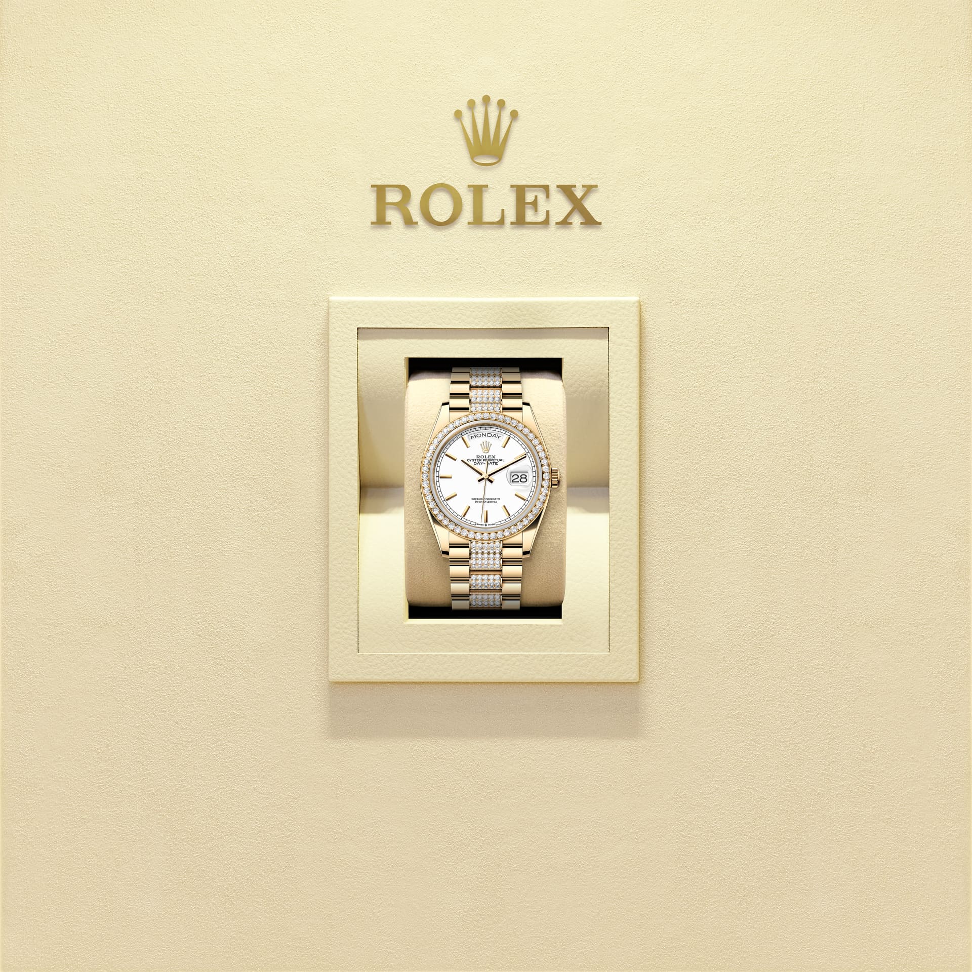 Oyster Perpetual Day-Date 36 ทำจากทองคำ 18 กะรัต พร้อมหน้าปัดสีขาว ขอบหน้าปัดประดับเพชร และสาย President ประดับเพชร