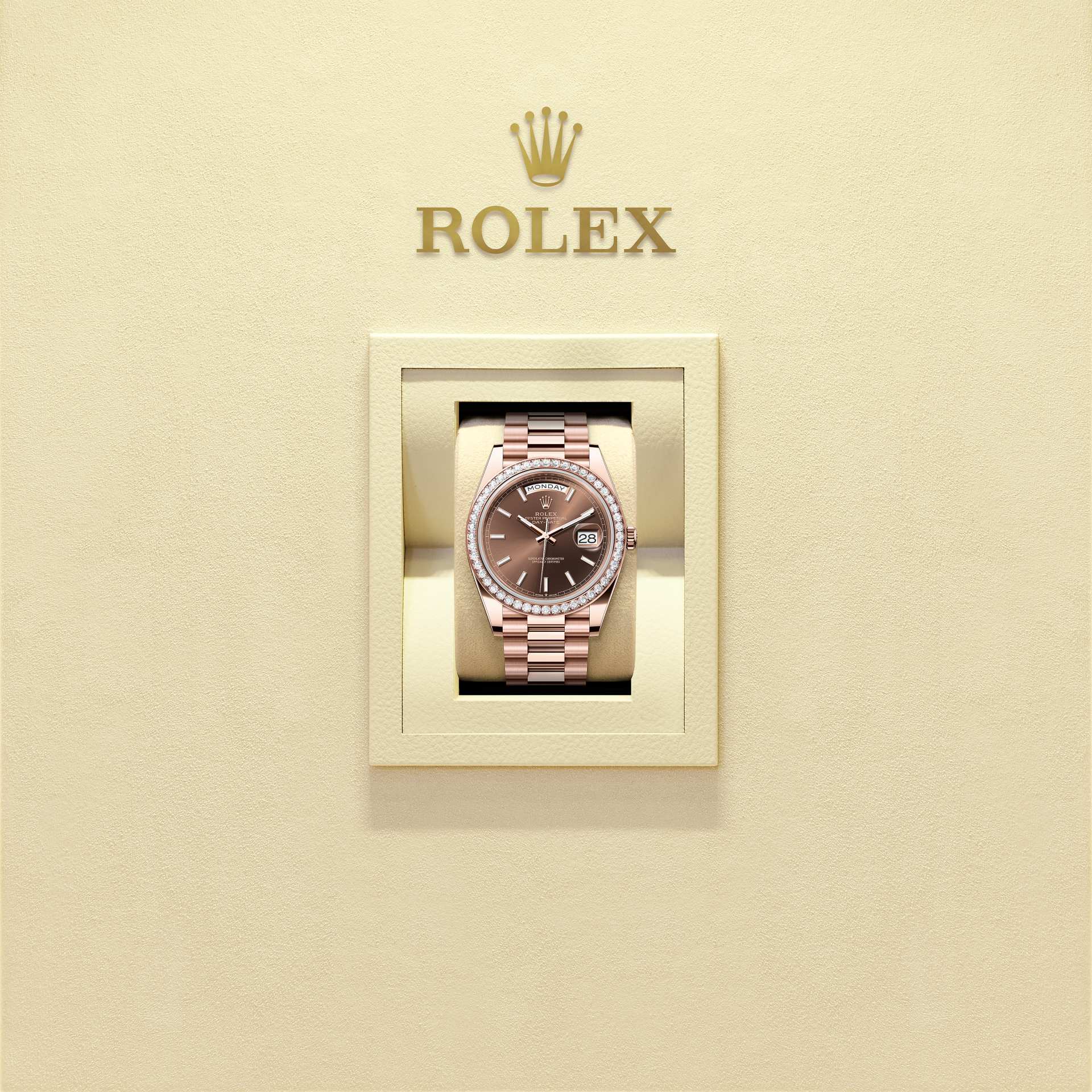 Oyster Perpetual Day-Date 40 ทำจากEverose gold 18 กะรัต พร้อมหน้าปัดสีช็อกโกแลต ขอบหน้าปัดประดับเพชร และสาย President