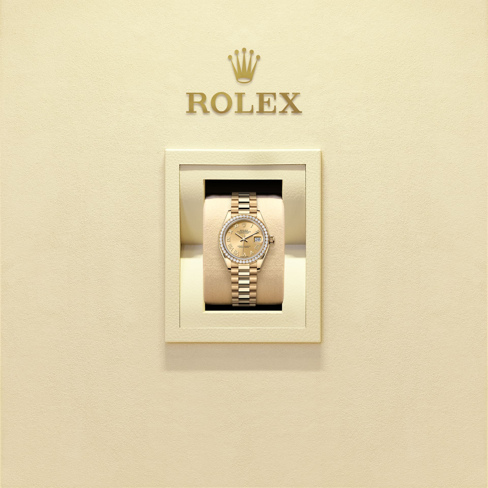 Oyster Perpetual Lady-Datejust ทำจากทองคำ 18 กะรัต โดดเด่นด้วยหน้าปัดสีแชมเปญ และสาย President