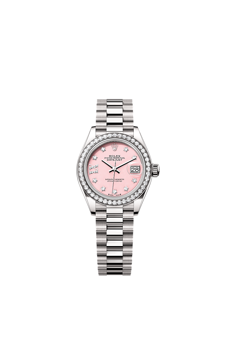 Oyster Perpetual Lady-Datejust ทำจากทองคำขาว 18 กะรัต โดดเด่นด้วยหน้าปัดโอปอลสีชมพูประดับเพชร และสาย President