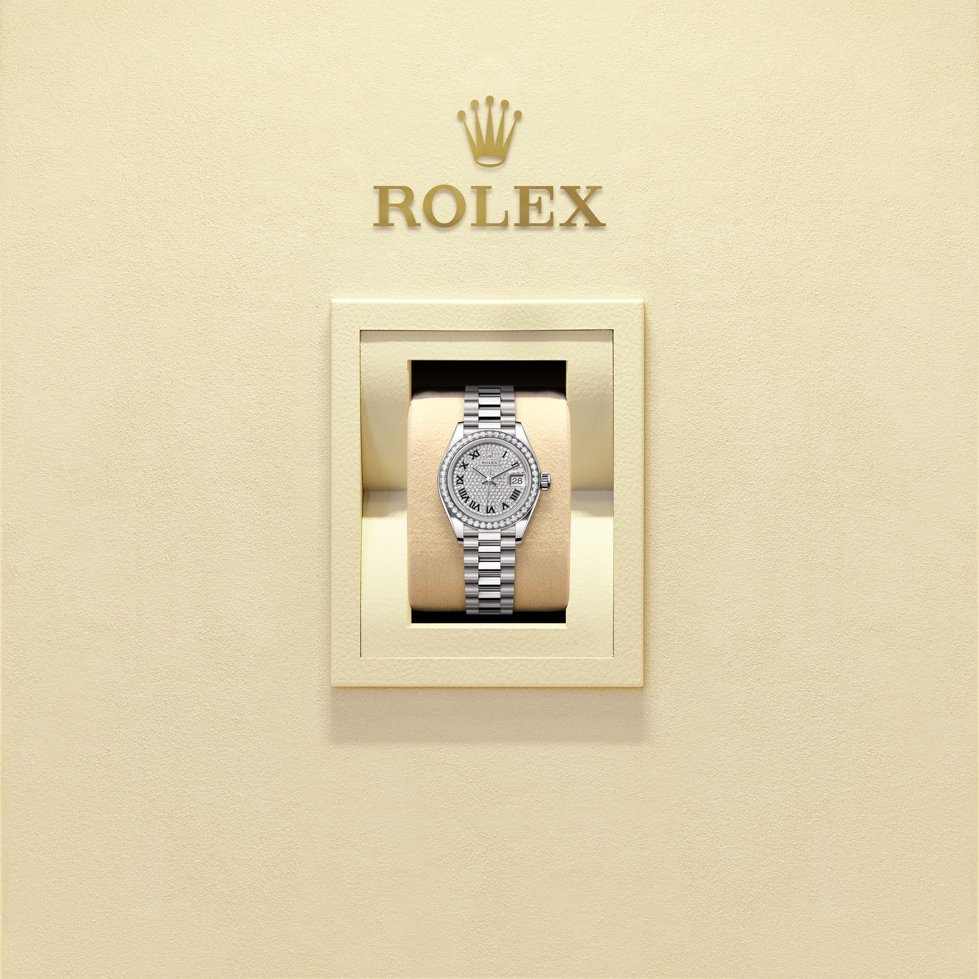 Oyster Perpetual Lady-Datejust ทำจากทองคำขาว 18 กะรัต โดดเด่นด้วยหน้าปัดประดับเพชร และสาย President
