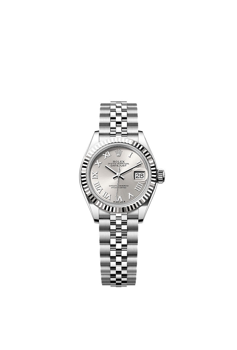 Oyster Perpetual Lady-Datejust ทำจากOystersteel และทองคำขาว โดดเด่นด้วยหน้าปัดเงิน และสาย Jubilee